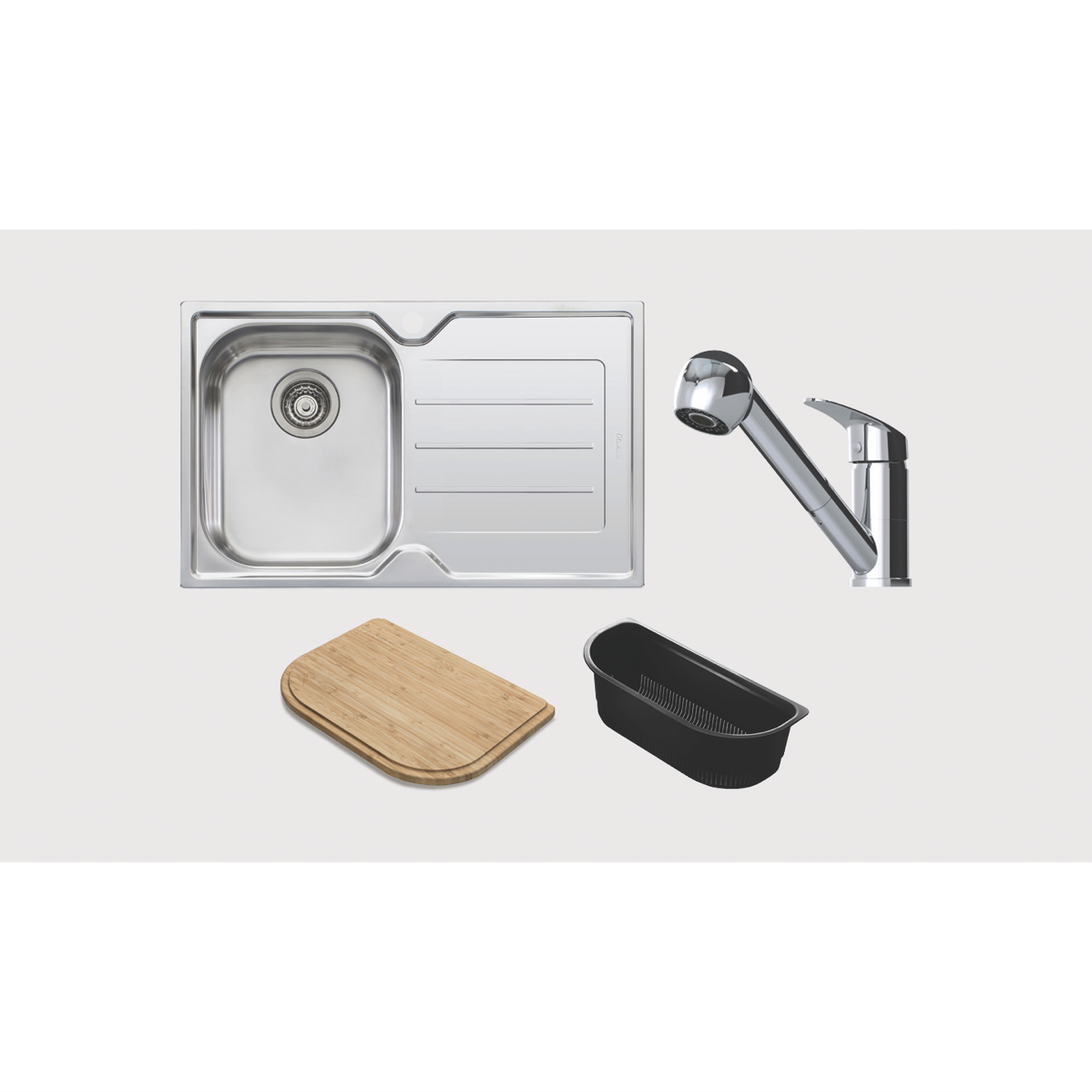 Bring sleek stainless steel style and modern convenience to your kitchen with the Oliveri Grab and Go Pack. This topmount sink and pull-out spray mixer combo pairs a generous 21L single bowl sink with integrated right hand drainer and a stylish chrome mixer tap. Crafted from durable 304 grade 18/10 polished stainless steel the sink offers a contemporary look that complements any decor. The 330 x 400mm bowl accommodates pots and pans with ease while the pull-out spray mixer makes quick work of rinsing and cleaning. With a sleek 180mm height the mixer tap brings exceptional functionality and makes filling pots a breeze. Both sink and tap boast a premium finish that withstands daily use while retaining its lustrous sheen. This water efficient kit is WELS 5 star rated using just 5 litres per minute to help conserve water. Installation is a snap with the basket waste and colander included. Add the bamboo board for an eco-friendly prep surface. With a lifetime warranty on the sink and 10 years on the tap this Oliveri pack provides exceptional value for Australian kitchens. The manufacturer's part number for this product is FL121580-P-PK. Bring home durable style and everyday convenience with the Oliveri Grab and Go Pack today.