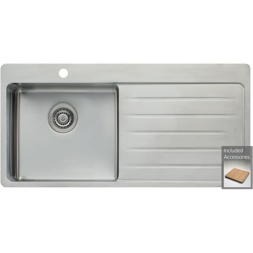 Make a bold statement in your kitchen with the Oliveri Left Hand Single Bowl Inset Sink. Crafted from durable stainless steel this sink provides a generous 39L bowl capacity and right hand drainer to tackle dishes with ease. Measuring 205mm high 510mm deep and 1035mm wide it fits standard 600mm cabinets and features a 1019 x 494mm cut-out size for seamless installation. Top mount design allows for a sleek look. The single tap hole caters to different faucet configurations. Accessories like the bamboo preparation board enhance functionality. Sink clips basket waste and chopping board are included for convenience. With a lifetime manufacturer's warranty this sink is built to last. Bring reliable performance and style to your kitchen with the Oliveri Left Hand Single Bowl Inset Sink. The manufacturer's part number for this product is SN1021. Check out this modern sink solution today.