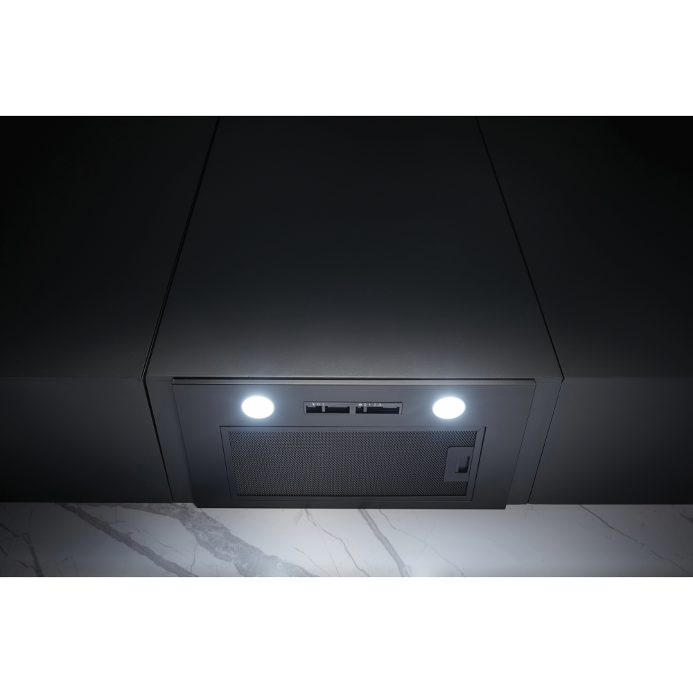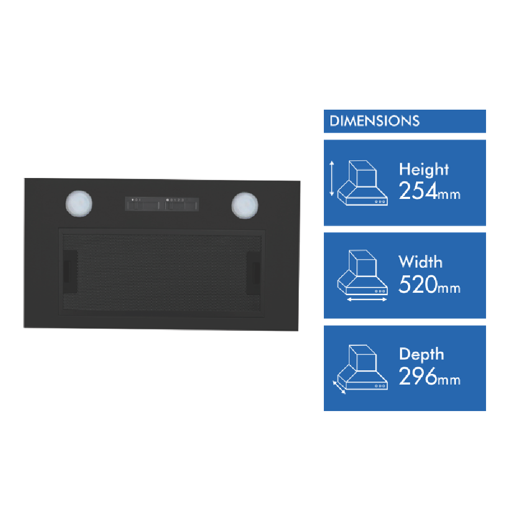 Extract steam and food odours from your kitchen whilst keeping it stylishly on-trend with this matte black Omega 52cm Undermount Rangehood ORU52MB. Integrated within your kitchen cabinetry for a seamless fit the controls on this rangehood are equally minimalist with a slide switch for selecting one of three speeds for your simmering boiling or deep-frying cooking requirements and another to switch the light on or off. Plus two LED lights provide excellent visibility whilst generating very little heat and consuming very little energy. It has a 683m3/hr net extraction capacity. Keeping the extraction of your rangehood running optimally is easy thanks to the removable washable filter. An effortless match to any new black appliance this Omega Rangehood is perfect for any kitchen upgrade or build.