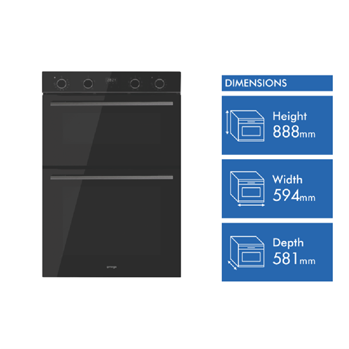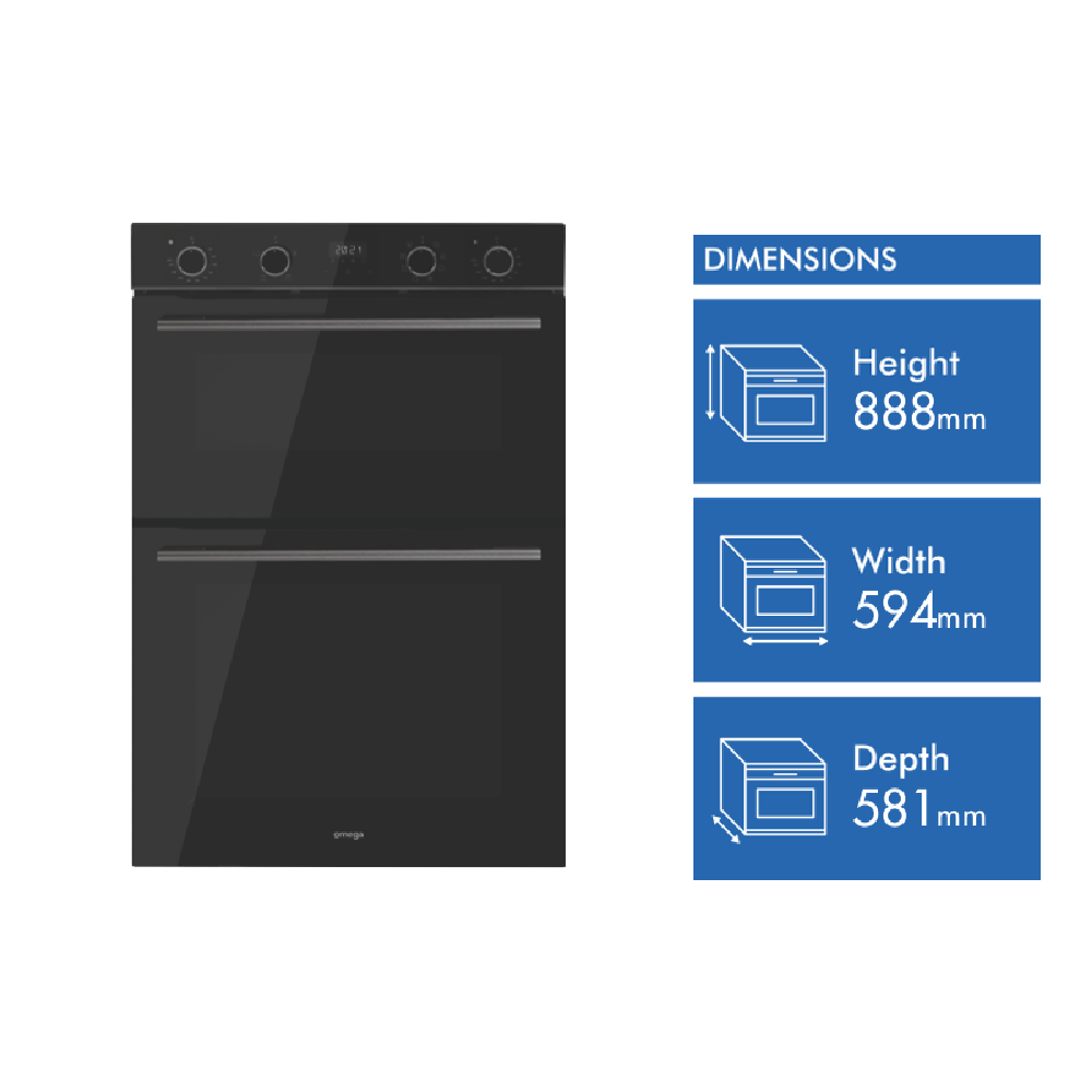 Want to take your cooking to the next level? The Omega 60cm 12 Function Double Oven in Midnight (ODO6012M) is your versatile kitchen companion. With a spacious 32.5L upper oven and a generous 56L lower oven you'll have plenty of room to whip up delicious meals. The upper oven features light grill conventional and classic bake functions while the lower oven offers light conventional pastry bake grill fan & grill fan forced brown (boil) and defrost options. Knob controls and a touch control timer make operation a breeze. Plus with handy features like LED display 5 shelf positions 2 interior lamps turbo ring elements cavity cooling system and removable doors and inner glass cooking and cleaning is easier than ever. This electric double oven also comes with 3 chrome wire shelves 1 enamelled baking tray 1 grill insert and 1 tempered glass tray. And for added peace of mind enjoy a 3 year manufacturer's warranty. Ready to elevate your culinary creations?