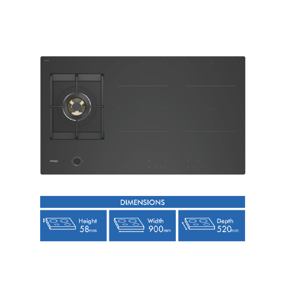 The Omega 90cm Gas & Induction Hybrid Cooktop (model OCIG905B) blends the precision of induction with the power of gas giving you the best of both worlds in a single stylish appliance. Featuring a premium black ceramic glass surface with a brass wok burner heavy-duty cast iron trivets and responsive touch and knob controls it s designed for cooks who want flexibility without compromising on performance. Whether you re simmering delicate sauces or stir-frying at high heat this cooktop adapts to your cooking style with precision speed and elegance.