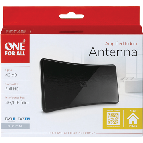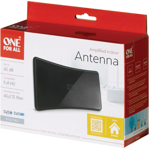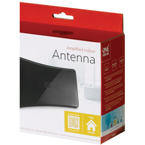 Enhance your TV viewing experience with the One For All 42dB Gain Amplified Indoor Antenna. This high-performance indoor antenna boosts weak digital TV signals with its 42 decibels gain to deliver clear reception. Slim and lightweight it conveniently mounts on walls or sits on entertainment units to pull in channels up to 120km away. The 6VDC power adapter ensures a stable power supply for uninterrupted viewing while the sleek low profile design blends into your home decor seamlessly. With simple plug-and-play installation start enjoying free-to-air HD channels on your TV instantly. The manufacturer's part number for this product is UE-SV9420. Bring home this indoor antenna today for fuss-free access to digital TV broadcasts.