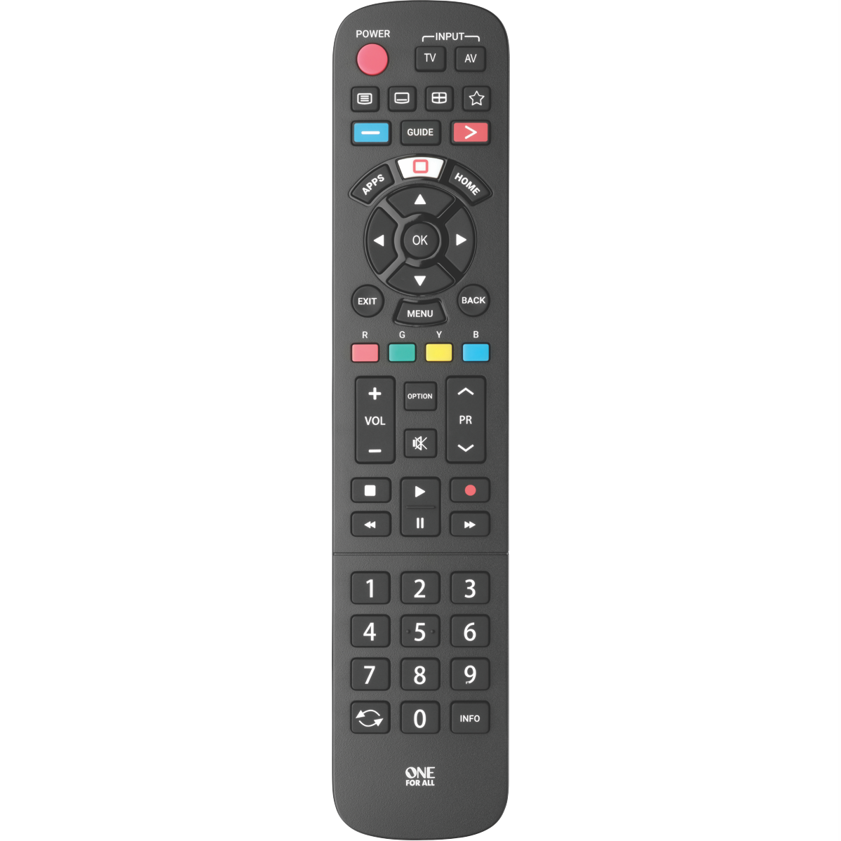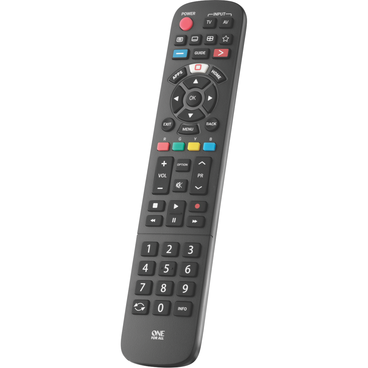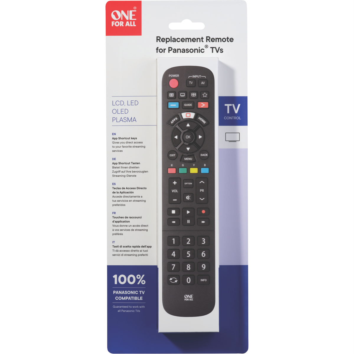 With a simple setup and easy-to-use layout the One For All Panasonic Replacement Remote lets you control your TV with ease. This universal remote is designed for compatibility with Panasonic TVs including LCD LED plasma OLED and QLED models. Its intuitive button layout allows you to navigate channels and settings quickly. Program it in moments with the quick setup codes then sit back as you enjoy one-touch control of essential functions like volume input switching and more. With a 12 month manufacturer's warranty for added peace of mind this remote makes an ideal replacement for lost or damaged Panasonic TV remotes. Convenient affordable and reliable the One For All remote delivers fuss-free control so you can get straight to enjoying your favourite shows. Check out this quality universal remote today for a streamlined home entertainment experience. The manufacturer's part number for this product is UE-URC4914.