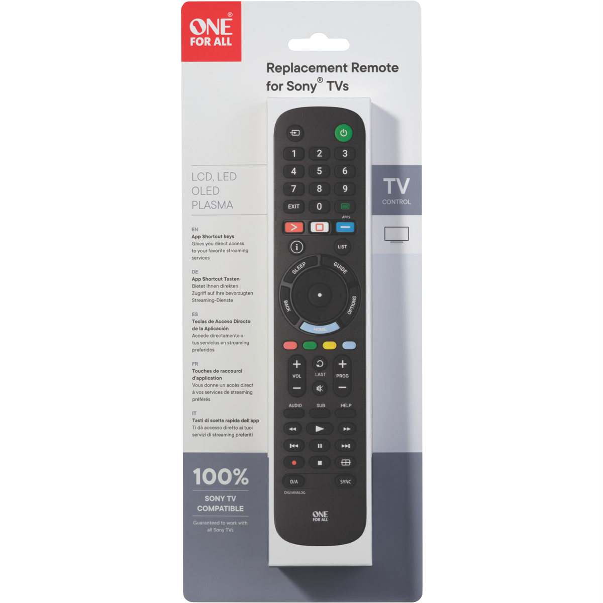 Tired of losing your Sony TV remote down the back of the couch? The One For All replacement remote is the perfect solution for seamlessly controlling your Sony TV. This universal remote is specifically designed to be compatible with a wide range of Sony LCD LED OLED and QLED televisions so you can conveniently command your TV from the comfort of your couch. With easy setup through auto-code search and simple programming you'll be channel surfing and adjusting volume in no time. The sleek and ergonomic design feels natural in your hand while large rubber buttons are easy to press but won't accidentally get bumped. Take back control of your Sony viewing experience with the One For All replacement remote today. The manufacturer's part number for this product is UE-URC4912.