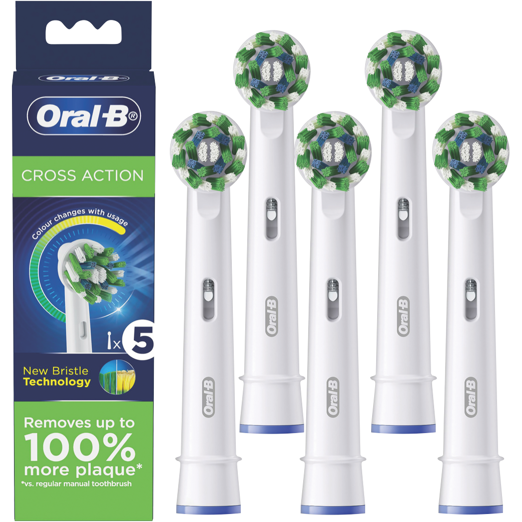Keep your smile at its best with these Braun Oral B Cross Action Replacement Brush Heads. Each pack includes 5 replacement heads featuring X-shaped bristles that lift trap and remove plaque effectively. The 2200 angled bristles are positioned at 16 degrees to clean efficiently along the gumline for superior plaque removal. You'll know exactly when it's time for a change thanks to the usage indicator - the bristles turn yellow when they need replacing. These heads are compatible with most Oral-B rechargeable handles (except Pulsonic Sonic Complete Vitality Sonic CrossAction Power Clic and Oral B IO). Model number: EB50RX5.