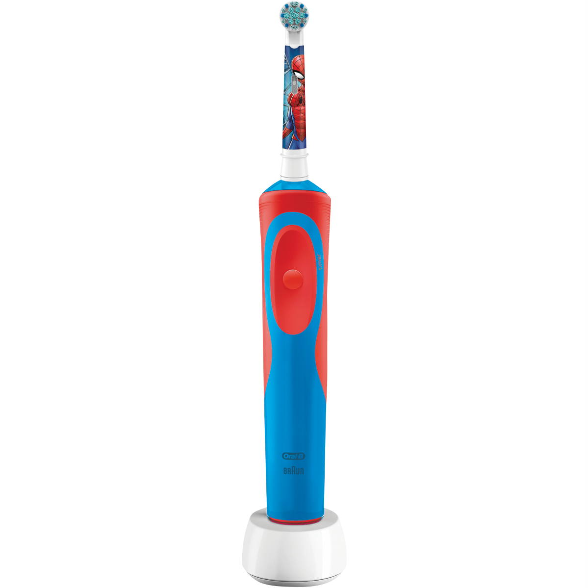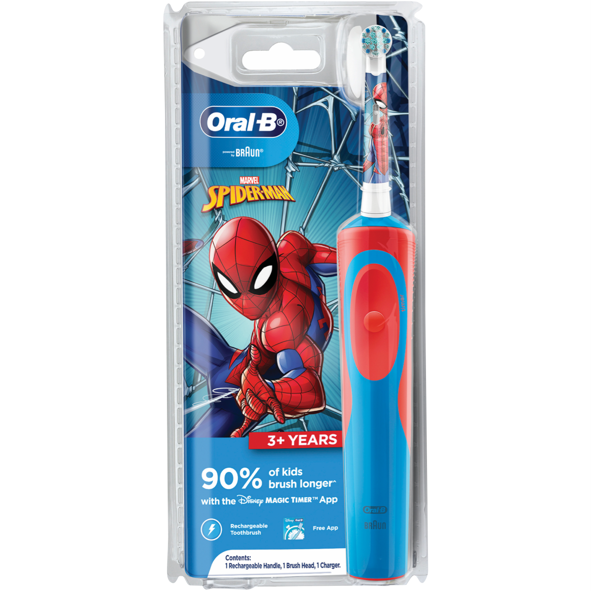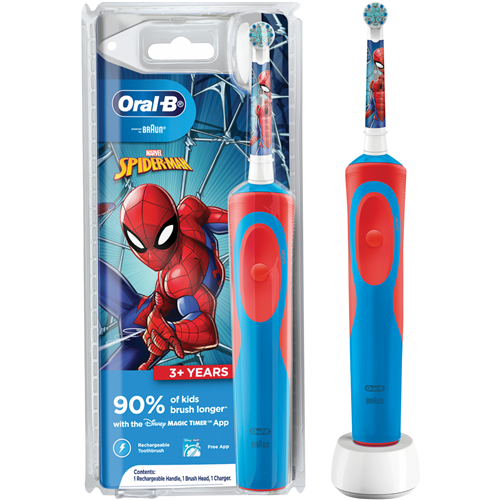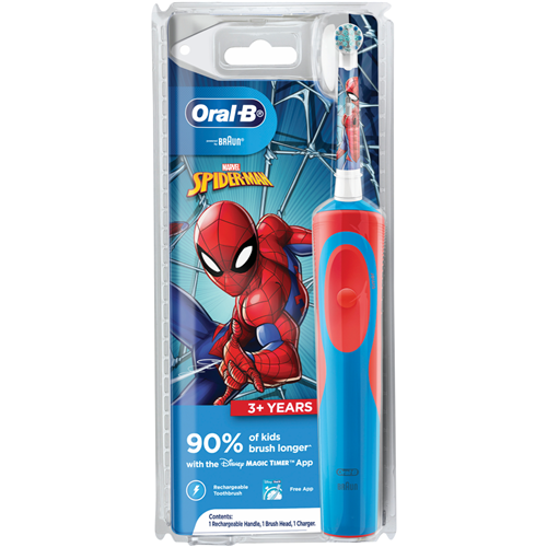 Give your kids' oral health a boost with the Oral B Vitality Kids Spiderman electric toothbrush. This fun Disney-themed brush features a rotating head that surrounds each tooth for a thorough clean. The built-in two-minute timer encourages proper brushing time while the rechargeable battery means no expensive replacements. Kids will love their new Spiderman brush buddy that makes taking care of their teeth fun. Multiple brush heads are included for when it's time to switch ensuring your child always has a fresh effective brush on hand. Teach your kids healthy habits and make brush time entertaining with the Oral B Vitality Kids Spiderman electric toothbrush. The manufacturer's part number for this product is VITALITYKSW. Check it out today!