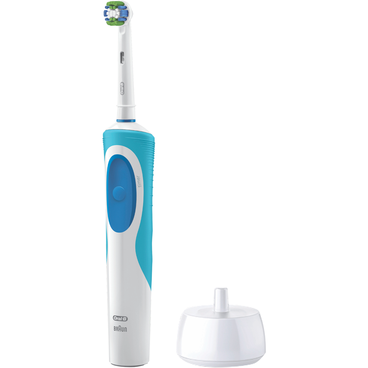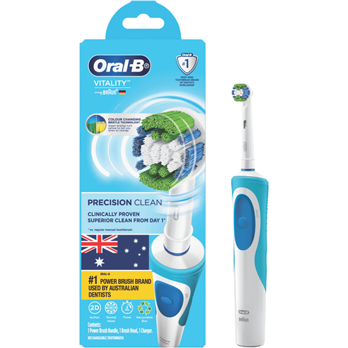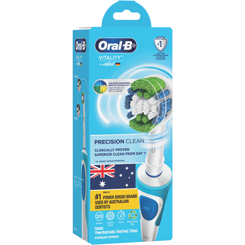 Clean your teeth with precision and power using the Oral B Vitality Precision Clean Rechargeable Electric Toothbrush. This electric toothbrush surrounds each tooth to remove up to 100% more plaque than a manual toothbrush for a deep clean you can see and feel. The two-minute timer ensures you brush for the dentist-recommended amount of time while the rechargeable battery means you'll never run out of power. By removing more plaque the Vitality Precision Clean Toothbrush keeps your teeth pearly white and your gums healthy. The manufacturer's part number for this product is VITALITYPC. Bring the precision of an electric toothbrush into your daily dental routine today.