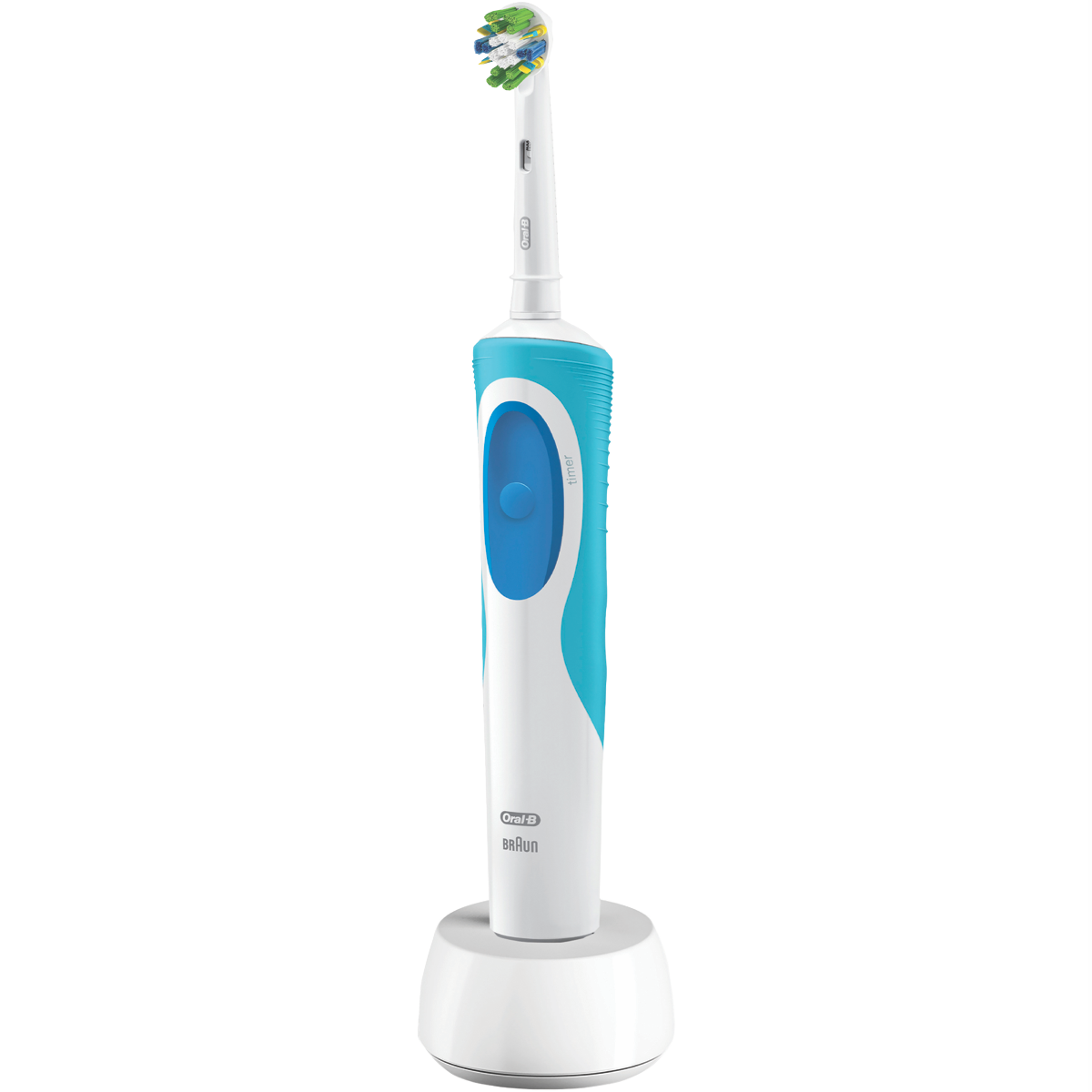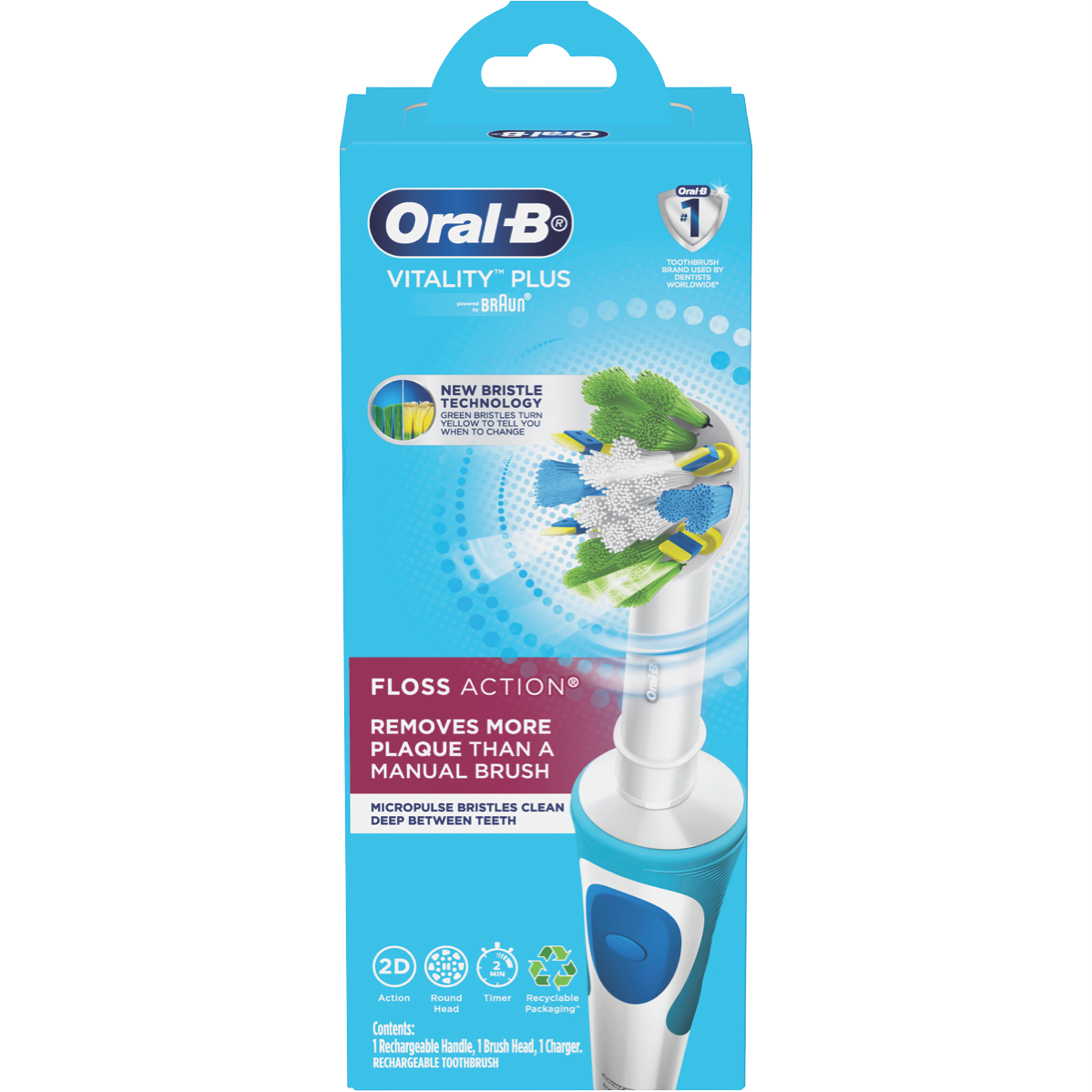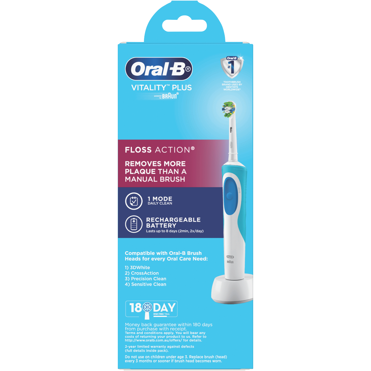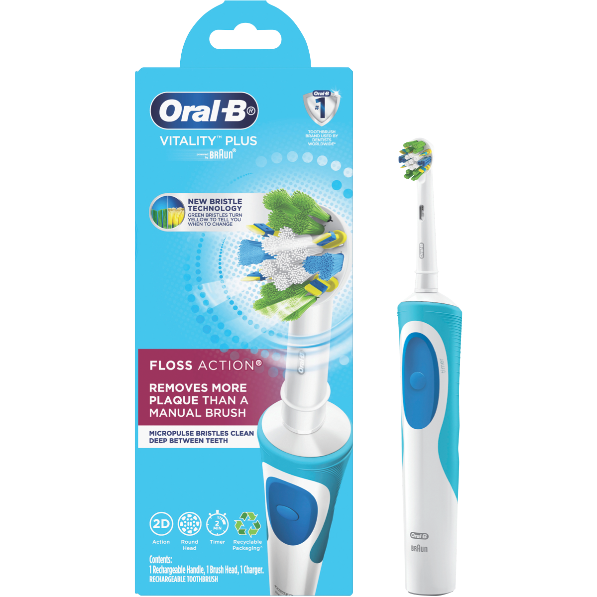 Achieve deeper cleaning and healthier gums with the Oral B Vitality Plus FlossAction Electric Tooth. This electric toothbrush features a 2 minute timer to guide you through the dentist-recommended brushing time. The FlossAction brush head oscillates and rotates to break up plaque and sweep away food debris in hard-to-reach areas. Its pressure sensor stops the pulsations if you brush too hard to protect your gums. When it's time for a replacement the green bristles turn yellow to let you know. With just one Daily Clean mode this toothbrush keeps oral hygiene simple. It runs off a rechargeable battery that lasts up to 8 days on a single charge. For your convenience a charger is included. Backed by a 2 year manufacturer's warranty the Vitality Plus brings you an effortless way to care for your teeth and gums. The white color allows this electric toothbrush to complement any bathroom décor. Oral B designed the Vitality Plus to be compatible with all of their oscillating and rotating brush heads except for the iO. The manufacturer's part number for this product is VITALITY+FA. Bring home the Oral B Vitality Plus and experience a thorough clean with less effort.