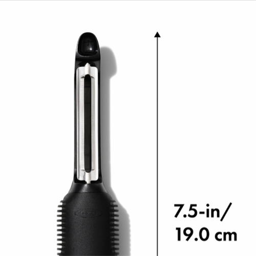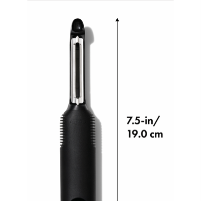 The OXO Good Grips Swivel Peeler is a must-have kitchen tool for effortless peeling. With a soft non-slip grip and hardened stainless steel blade this peeler easily glides through fruits and vegetables to remove skin with precision. The built-in potato eyer is perfect for removing blemishes or eyes from potatoes in one smooth motion. Simplify meal preparation with the OXO peeler's swivel action that follows the contours of produce for consistent results. Durable and dishwasher safe this essential peeler will be your new go-to for creating healthy meals and snacks. The ergonomic handle provides control and reduces hand fatigue while the sharp blade makes quick work of peels. Bring ease and confidence to your kitchen tasks with the OXO Good Grips peeler. Check out this quality kitchen tool to add to your culinary arsenal today. The manufacturer's part number for this product is 48000.