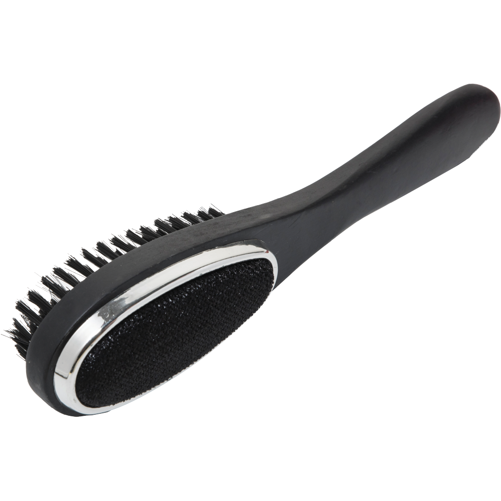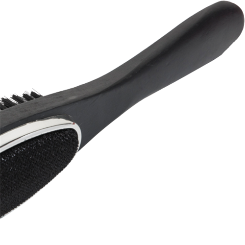 This versatile 3-in-1 clothes brush from Pacifica is the ultimate lint removal and grooming tool for your wardrobe. The stiff bristle brush effortlessly lifts away lint hair and fibers from clothing and upholstery while the cushioned pad gently removes fuzz and pilling. The built-in shoe horn integrated into the handle provides added convenience when slipping on shoes. With its black finish and ergonomic design this quality brush blends seamlessly into any space. Keep your clothes sofas and shoes looking their best with the Pacifica 3-in-1 clothes brush. The manufacturer's part number for this product is CB01. Add this handy grooming essential to your cart today.