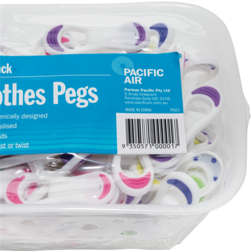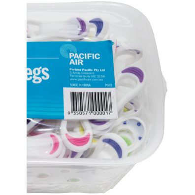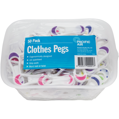 Take the hassle out of hanging laundry to dry with the Pacifica 50 Piece Peg and Basket set. This clothes peg and clip set features 50 ergonomically designed pegs that won't twist or rust thanks to their UV stabilized and durable plastic construction. Available in a stylish white and multi colorway these sturdy pegs effortlessly clip onto clothing items without damaging delicate fabrics. The accompanying peg basket provides convenient storage keeping your pegs neatly organized and easily accessible when it's time for the next load of laundry. With their smart design these hardworking pegs take the strain out of hanging washing on the line allowing you to breeze through this household chore. Don't let laundry day drag you down; make easy work of it with the Pacifica 50 Piece Peg and Basket set. The manufacturer's part number for this product is PG01. Add this peg and clip set to your cart today for fuss-free laundry drying.