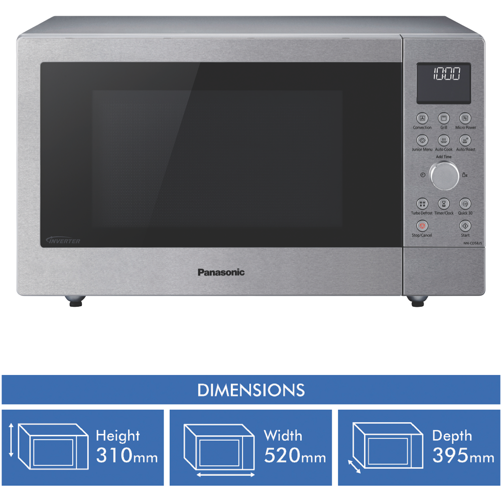 Create outstanding meals without the need for multiple cooking appliances using the Panasonic 27L 1000W 3-in-1 Convection Oven NN-CD58JSQPQ. Enjoy a wide range of delicious lunches and dinners just by using your microwave - with microwave grill oven bake or combination cooking methods for cooking thousands of different foods utilising one convenient and efficient product. Combination cooking offers faster and tastier results to cooking your favourite meals; allowing you to either grill and microwave or use convention and microwave settings at the same time for various meals. To assist with quicker meal preparations this 3-in-1 convection microwave oven comes with 29 pre-set programs which includes 3 microwave menus 10 auto roast menus 8 auto cook menus and 8 kid-friendly auto menus. Panasonic's inverter technology produces optimal power control over cooking meals; leading to the preservation of taste texture and heating distribution of food every time you use the microwave. The smooth stainless steel exterior perfectly matches any kitchen aesthetic while its slimline design saves you valuable bench space.