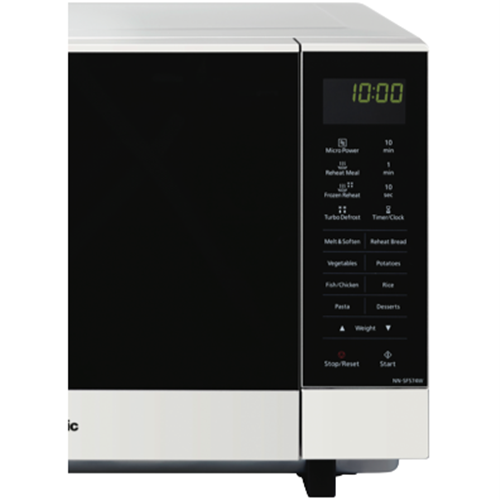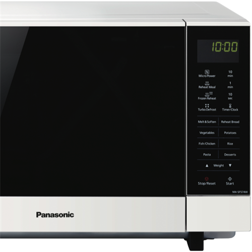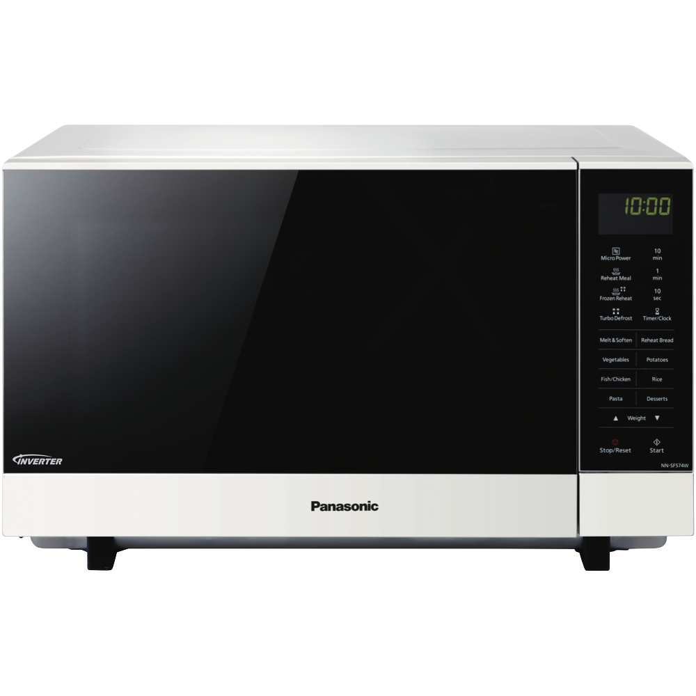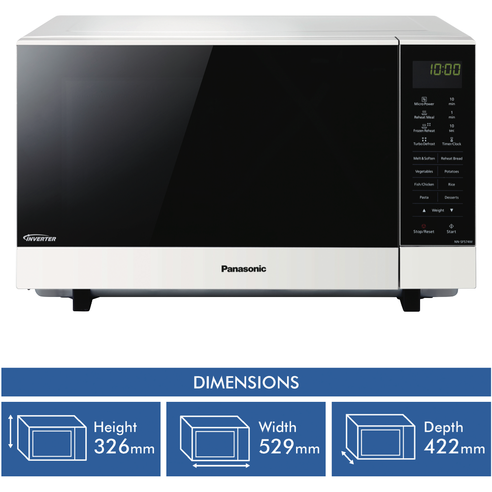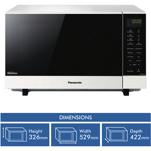 Sleek and spacious the Panasonic 27L 1000W Flatbed Microwave in crisp white is your kitchen's new necessity. Evenly cook reheat and defrost with Panasonic Inverter Technology. The wide flatbed design fits more inside and makes cleaning effortless. Check on cooking progress under the handy LED light. Auto Cook Reheat Meal Turbo Defrost and Frozen Reheat functions remove the guesswork from microwave mastery. With 6 adjustable power levels touch control panel and a generous 27 litre capacity you'll breeze through food prep. Measuring 52.9cm wide 32.6cm high and 42.2cm deep it fits most kitchen spaces. The manufacturer's part number for this product is NN-SF564WQPQ. Bring convenient cooking and easy cleaning home with the Panasonic 27L Flatbed Microwave.