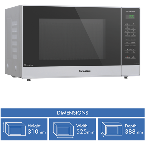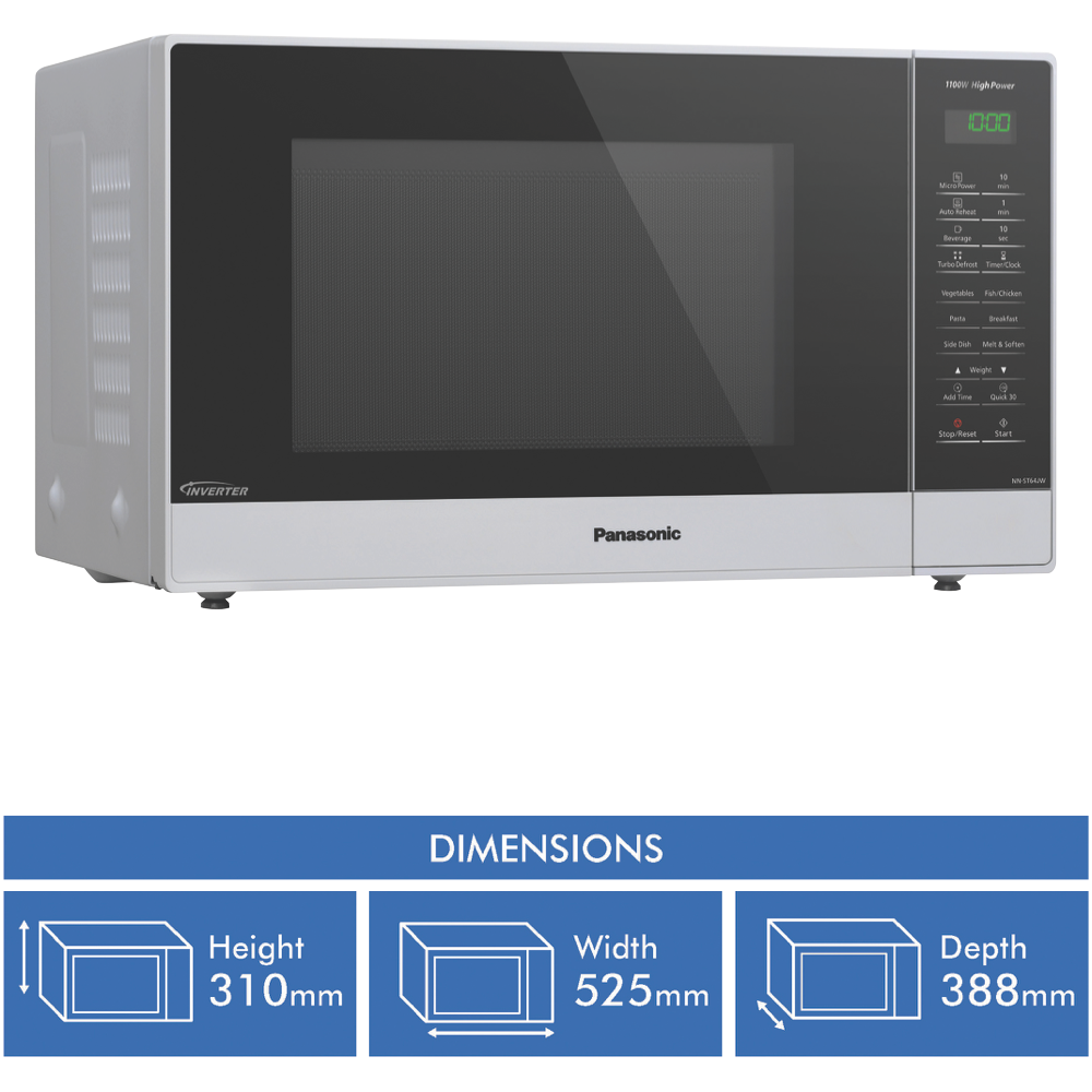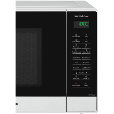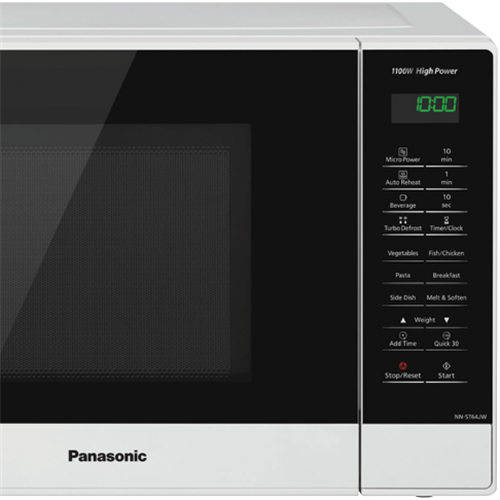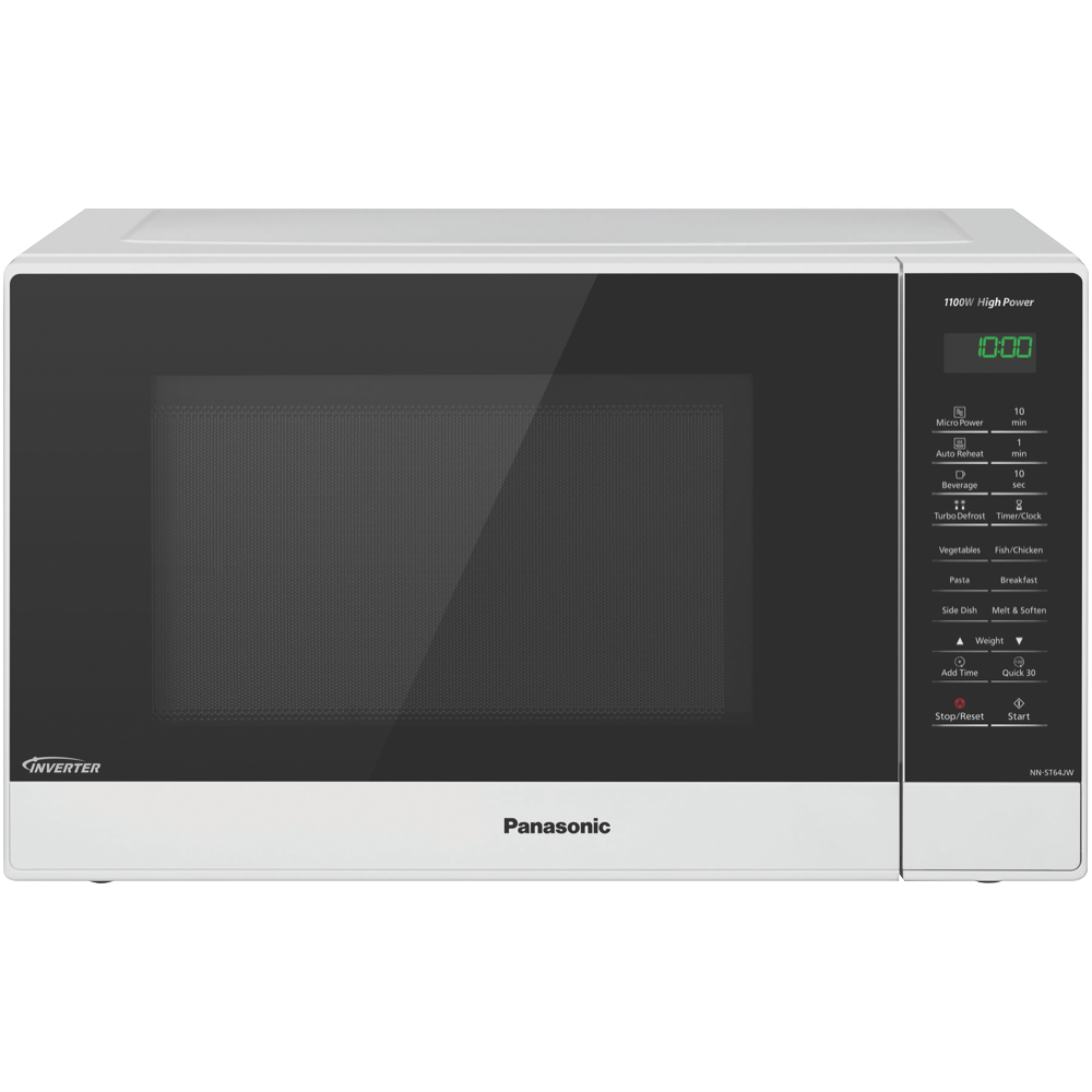 Savour the flavour and convenience of home-cooked meals with the Panasonic 32L 1100W Inverter Microwave in White. This versatile microwave features a generous 32 litre capacity perfect for families and an advanced Inverter technology that delivers consistent heating for optimal cooking results. The intuitive touch control panel and 11 power levels allow you to easily tailor every dish. Defrost food reheat leftovers or prepare a complete meal with the auto cook functions. The interior turntable measures 340mm wide ideal for plates up to 12 inches. Child safety lock provides peace of mind. With a 1 year warranty 1100 watts of power and sleek white finish this microwave simplifies meal prep while complementing modern kitchen aesthetics. Experience the difference an Inverter microwave makes - this Panasonic is built to last while delivering delicious family meals day after day. The manufacturer's part number for this product is NN-ST64JWQPQ. Bring home the Panasonic Inverter microwave and enjoy cooking for yourself and your loved ones.