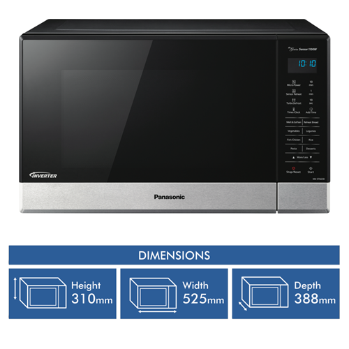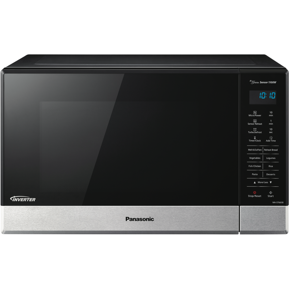 This 1100-watt Panasonic 32L microwave in sleek black stainless steel finish is the perfect addition to any modern kitchen. With a generous 32-litre capacity touch control panel and 11 auto cook menus you can quickly and conveniently prepare delicious meals for the whole family. The stylish black exterior and stainless steel door will complement any décor. The touch pad allows for easy selection of functions like defrost child lock and the large 340mm turntable means you can fit in multiple dishes. Measuring 52.5cm wide x 31cm high x 38.8cm deep this compact microwave can fit on countertops or built in. The intuitive controls and auto cook menus take the guesswork out of microwave cooking. Prepare perfect roasts vegetables pizza pasta and more with a simple touch. Defrost frozen foods without any hassle. The black stainless steel ensures durability and easy cleaning. With a 1 year warranty you can purchase with confidence. The manufacturer's part number for this product is NN-ST665BQPQ. See how convenient microwave cooking can be with the Panasonic 32L 1100W microwave.