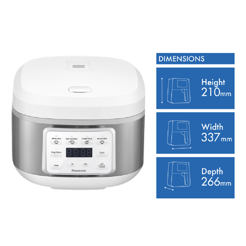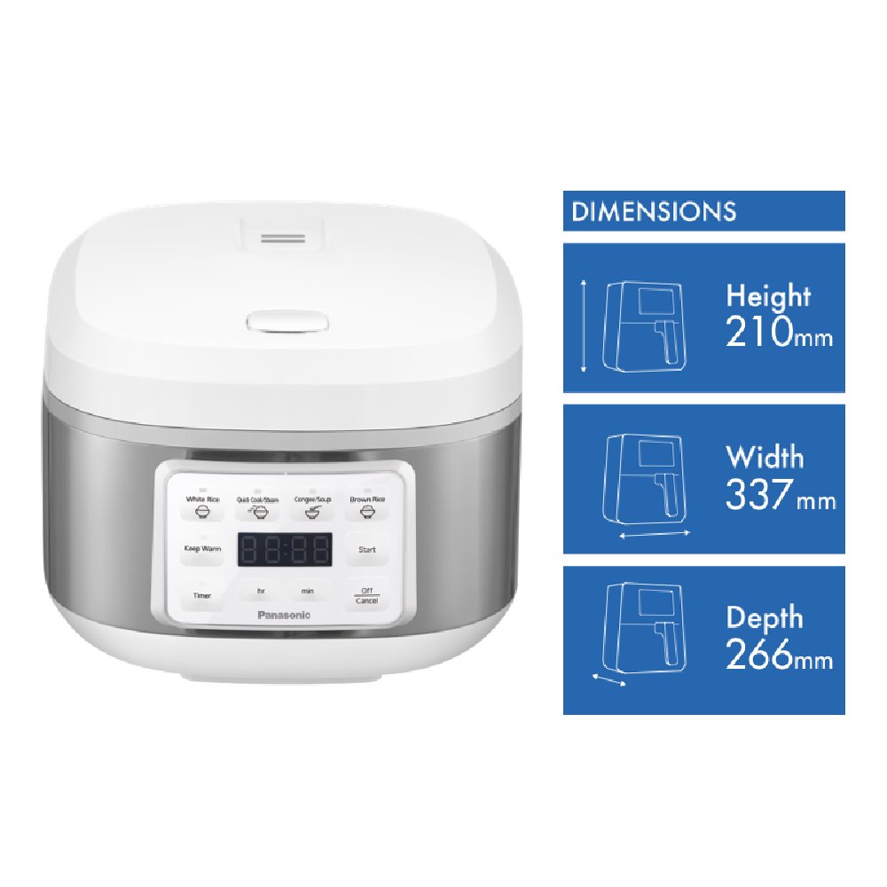 Enjoy perfectly cooked rice every time with the Panasonic 8 Cup Rice and Multi Cooker in white and silver. This versatile rice cooker and multi-cooker features a generous 8 cup capacity making it ideal for families or entertaining guests. The 1.2mm non-stick inner pan with Binchotan charcoal coating ensures your rice won't stick while the included steam basket allows you to prepare healthy steamed dishes. With multiple menu programs including white rice congee/soup quick cook/steam and brown rice you can create a variety of delicious meals with ease. The fuzzy logic technology automatically adjusts cooking temperatures during different stages for optimal results and the keep warm function keeps your food at the perfect temperature for up to 24 hours. Measuring 337mm wide 266mm deep and 210mm high this 770-watt rice cooker and multi-cooker will become a staple in your kitchen. The manufacturer's part number for this product is SR-DA152WST. Experience the convenience and versatility of the Panasonic 8 Cup Rice and Multi Cooker in your home today.