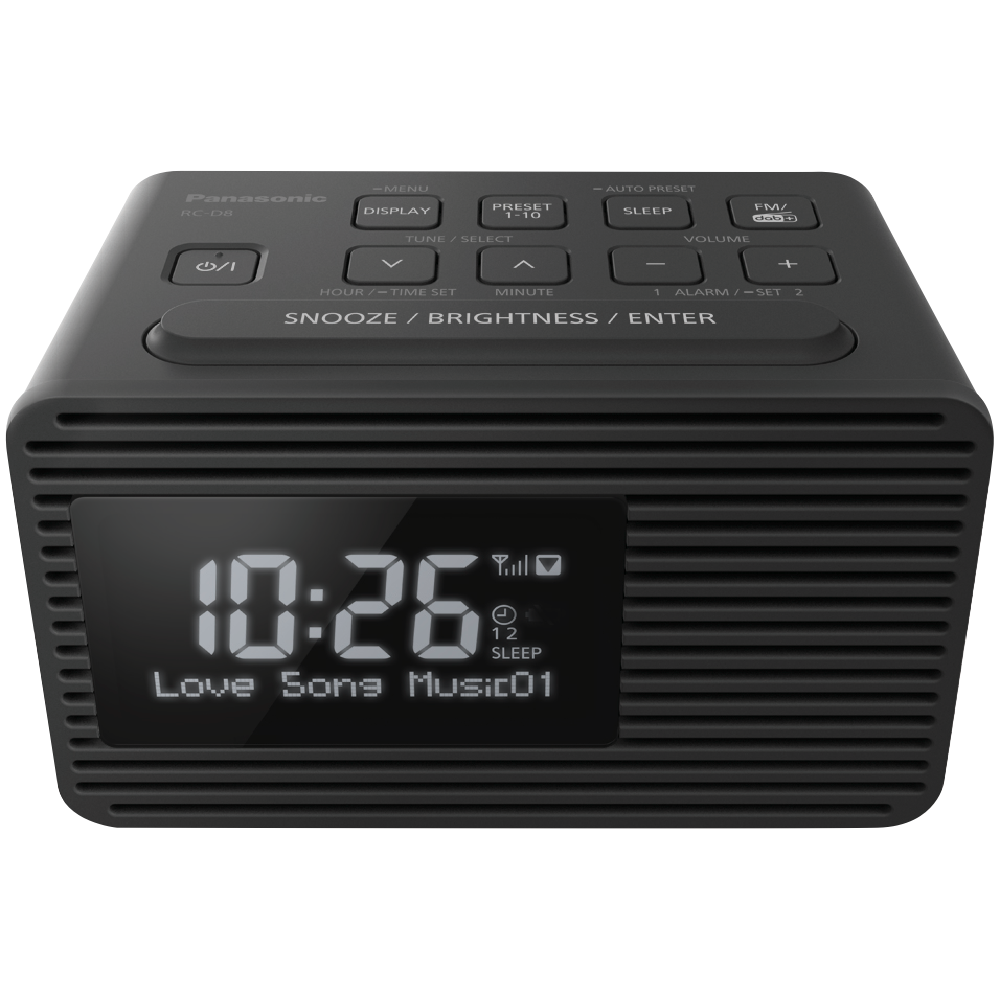 Drift off to your favorite DAB+ stations or wake up to your favorite FM radio shows with the Panasonic DAB+ FM Clock Radio. With 10 station presets and a clear LCD display this sleek black digital radio makes it easy to find and listen to all your favorite stations in crystal clear quality. The 5cm full-range speaker delivers rich 1W sound to fill your bedroom or kitchen. Set the dual alarm to wake up to the radio or buzzer. The built-in USB port lets you conveniently charge your smartphone overnight. With a lightweight compact design easy-to-use controls and 1 year manufacturer's warranty the Panasonic DAB+ FM Clock Radio is the perfect bedside or kitchen companion for all your music and talk radio needs. The manufacturer's part number for this product is RC-D8GN-K. Check out the Panasonic DAB+ FM Clock Radio today for quality digital radio performance.