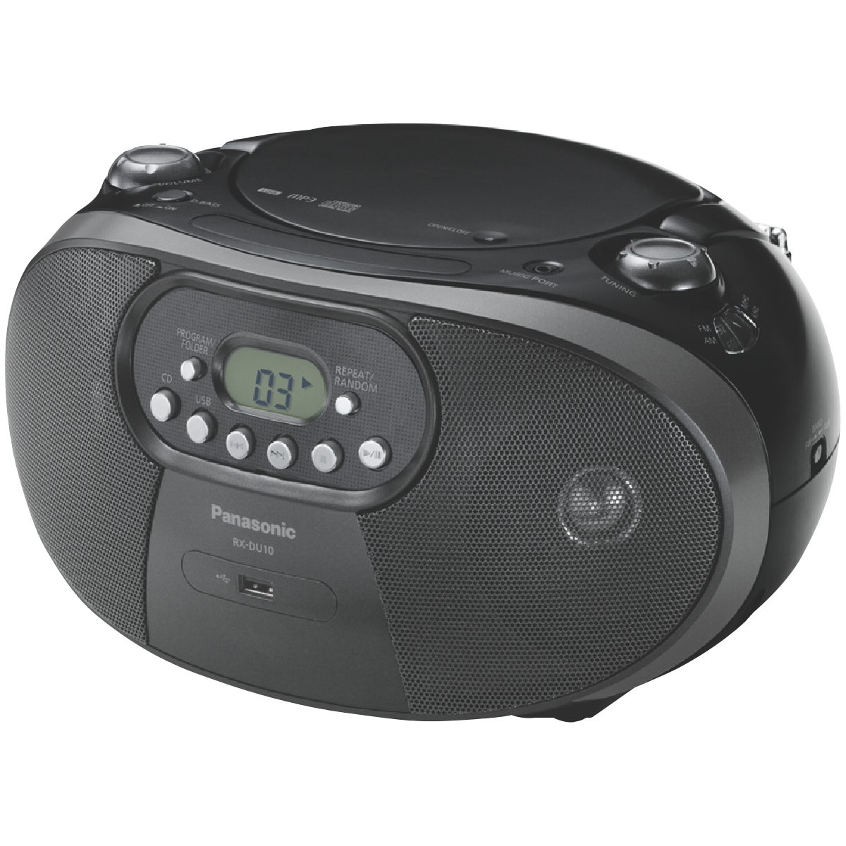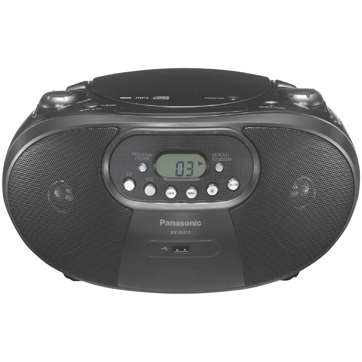 Listen to your favorite music and radio shows on the go with the Panasonic Portable AM/FM Radio and CD Player. This compact and lightweight radio offers rich room-filling sound with 4W total output power. Simply load a CD and enjoy your music collection or tune into AM and FM radio stations for news sports and more. At just 2.4kg this radio is easy to take anywhere. With 180mm height 280mm width and 340mm depth it fits nicely on desks shelves and countertops. The black color blends into any decor. Key features like CD playback AM/FM tuning and 4W total output cater to all your audio needs. Whether at home the office or on the move this radio keeps you entertained. The 12-month manufacturer's warranty provides added peace of mind. Give your ears a treat with the well-rounded sound of the Panasonic Portable AM/FM Radio and CD Player. The manufacturer's part number for this product is RX-DU10GN-K. Check out this versatile audio companion today.