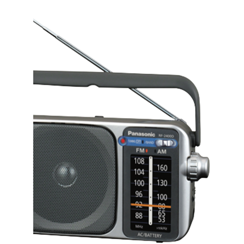 Tune in and enjoy your favorite radio stations on the go with the Panasonic Portable Radio AM/FM. This lightweight silver radio delivers clear sound through its 10cm full range speaker and packs 770mW of total output power. With one-touch station presets automatic frequency control and a convenient tuning LED finding and listening to your preferred stations is a breeze. The sleek compact design makes it easy to take this radio anywhere. Powered by 4 AA batteries (included) you'll get hours of entertainment whether at home work or on the road. At just 0.690kg and measuring 122mm x 234mm x 82mm the Panasonic Portable Radio AM/FM is the perfect portable audio companion. Backed by a 1 year manufacturer's warranty this durable radio provides reliable performance you can count on. Rediscover the simple joy of radio with the Panasonic Portable Radio AM/FM. The manufacturer's part number for this product is RF-2400DGN-S. Learn more about this versatile portable radio today.