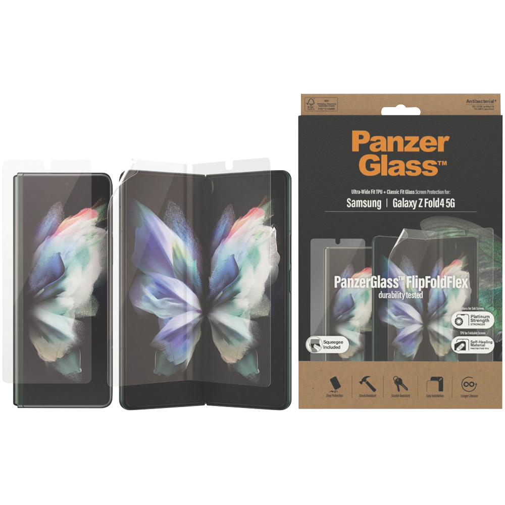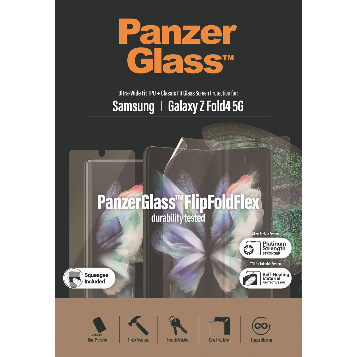 Make no compromises when it comes to protecting your Galaxy Z Fold4. This clear screen protector by Panzer Glass safeguards your Fold4's expansive Infinity Flex Display without inhibiting touch sensitivity. Tailor-made for the Galaxy Z Fold4's unique dimensions this slim 0.2mm screen guard offers edge-to-edge coverage across the 6.2 cover screen and 7.6 main screen. Its tempered glass construction and patented etching process deliver advanced impact and scratch protection from daily wear and tear. Enjoy peace of mind with the included 2-year manufacturer's warranty. The manufacturer's part number for this product is 7311. Protect your investment in the Galaxy Z Fold4 with this crystal clear custom-fit screen protector.