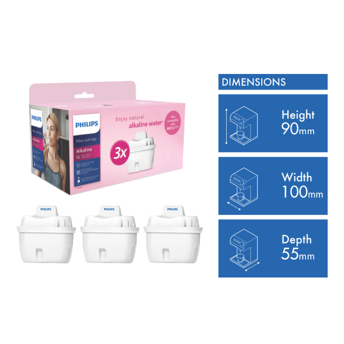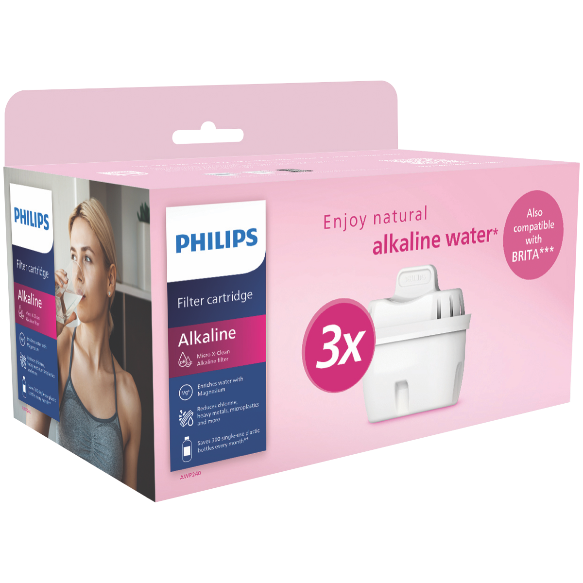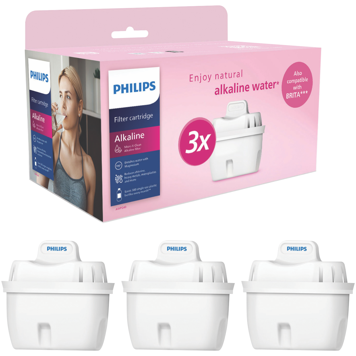 Refresh and revitalize your drinking water with the Philips Micro X-Clean Alkaline Filters 3 Pack. These white water filters are designed for use with Philips water filter jugs like the AWP2933 AWP2935 AWP2937 AWP2936 and AWP2938. They're also compatible with many Brita water filter jugs including MaxTra MaxTra+ PerfectFit and other drop-in oval filter jugs. Blended with natural mineral rocks and granular activated carbon these filters work to improve water taste and odor by reducing impurities like chlorine and sediment. The compact 90mm high by 100mm wide by 55mm deep size takes up minimal space in the fridge while delivering cleaner fresher tasting water for all your drinking needs. With a lightweight 0.41kg design they're easy to handle and replace each month. Give your family the gift of tastier healthier water straight from the tap with these Philips water filters. The manufacturer's part number for this product is AWP240H3/79. Check them out today.