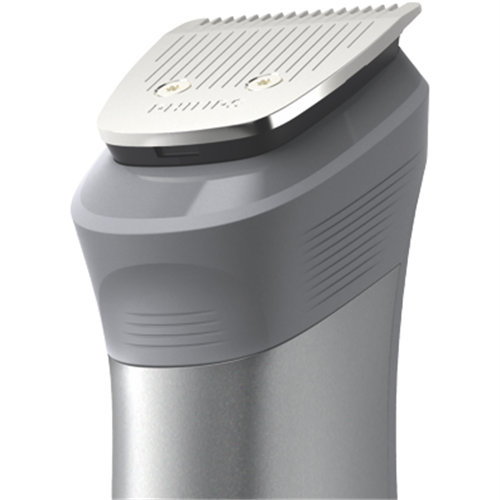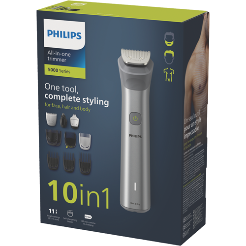 The Philips All In One Series 5000 Multi Groomer is the ultimate grooming tool for men who want it all. With 10 attachments this electric shaver tackles beards body hair nose and ear hair leaving you looking neat and tidy. The lithium-ion battery provides up to 120 minutes of cordless use with only a 5 minute charge. The precision trimmer scans your beard 125 times per second automatically adjusting power for optimal trimming on any length or thickness of facial hair. The rubber grip ensures total control as you trim wet or dry in the shower. Multiple length combs and a detail trimmer allow you to maintain facial styles with ease. The stainless steel self-sharpening blades stay sharp as the day you bought them delivering a close shave every time. This groomer comes with a cleaning brush soft pouch for storage and travel and a 2 year warranty for peace of mind. Achieve the look you want with the versatile Philips All In One Series 5000 Multi Groomer. The manufacturer's part number for this product is MG5920/15.