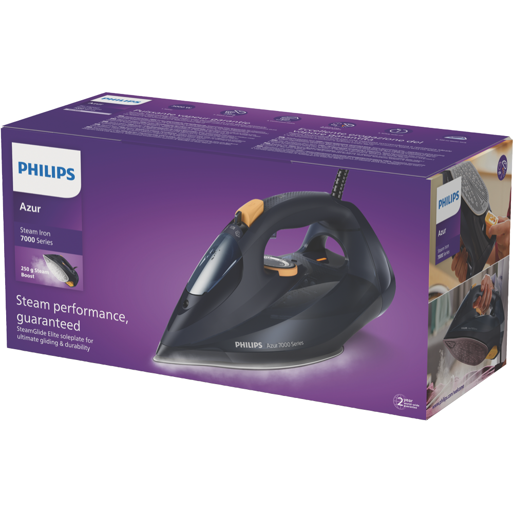 Tired of wrestling with stubborn wrinkles? The Philips Azur 7000 Series Steam Iron (DST7060/20) is your secret weapon for effortless ironing. With a powerful 2400 watt output and a continuous steam output of 55 grams per minute even the deepest creases don't stand a chance. Need an extra burst of steam for those extra-stubborn wrinkles? The 250 gram per minute steam shot has you covered. The SteamGlide Elite soleplate glides smoothly over any fabric while the 300ml water tank lets you power through piles of ironing. And when you're done the auto shut-off and Quick Calc release make maintenance a breeze. Plus with a stylish navy and yellow design this iron looks as good as it performs. Experience the convenience of variable steam settings drip stop vertical steaming and an energy saving mode. Backed by a 2 year manufacturer's warranty the Philips Azur 7000 Series Steam Iron (DST7060/20) is your reliable partner for crisp wrinkle-free clothes every time.