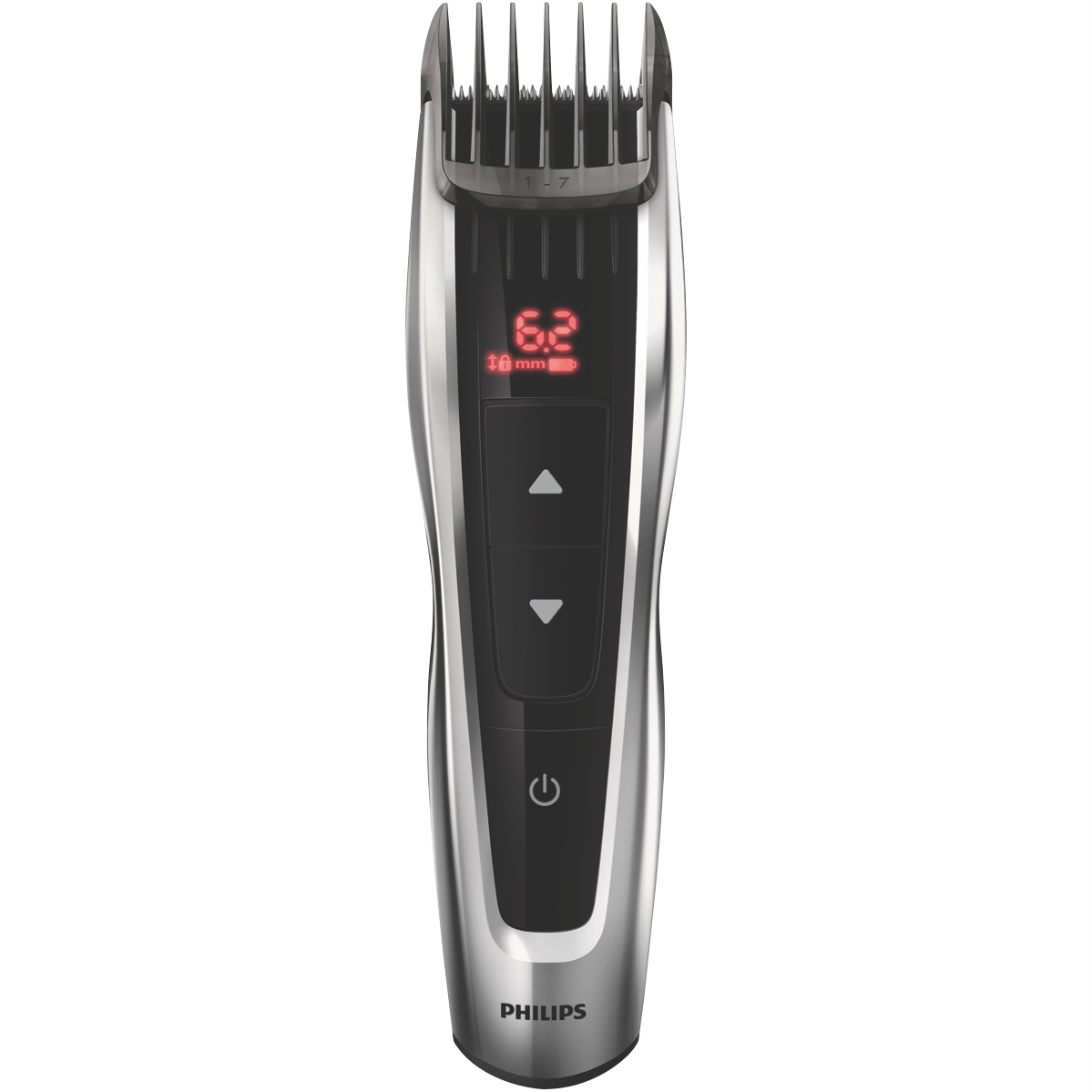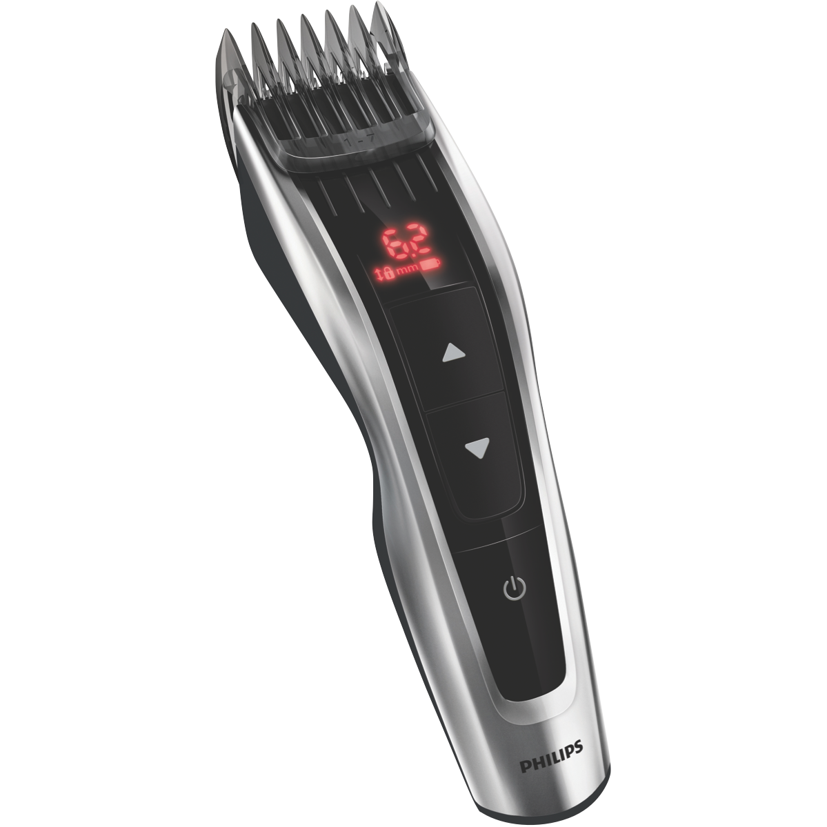 Achieve professional haircuts at home with the Philips Hair Clipper Series 9000. The chrome trimmer features stainless steel blades and a powerful auto turbo motor for precise smooth cutting. With 60 length settings from 0.5mm to 42mm you can create any style you want. The 0.2mm precision steps allow for ultra-fine adjustments. Cordless operation gives you flexibility while the Li-ion battery provides up to 1 hour of runtime per charge. Three adjustable combs and a travel pouch add convenience. The Philips hair clipper's durable motor and high-quality blades are built to last. Enjoy convenient salon-quality haircuts for the whole family. The manufacturer's part number for this product is HC9420/15. Check out the Philips Hair Clipper Series 9000 today for your at-home styling needs.