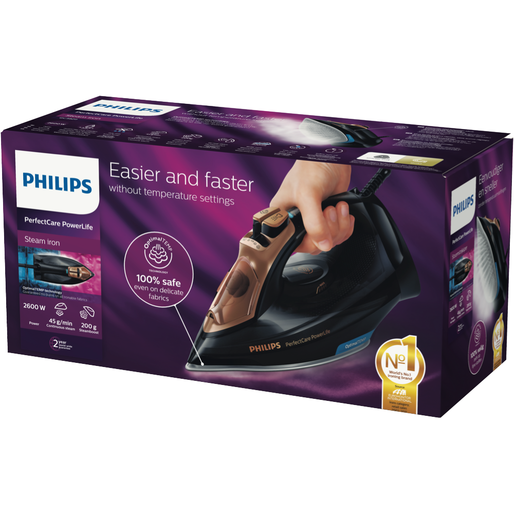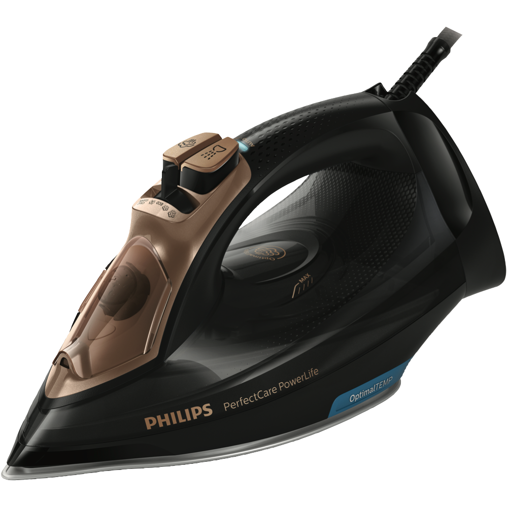 Say goodbye to wrinkles and hello to smooth crisp ironing with the Philips PerfectCare PowerLife Black Steam Iron. This powerful 2400W iron with SteamGlide Plus titanium soleplate glides effortlessly over fabrics to remove creases in no time. Its 300ml water tank capacity provides up to 45g/min of continuous steam output and a 185g/min steam shot to tackle even the toughest wrinkles. The built-in Calc Clean Slider makes descaling and cleaning a breeze. With its black colour 2kg weight and compact 312 x 147 x 127mm size this iron delivers top performance while adding a touch of elegance to your laundry. Auto shut off provides peace of mind. Backed by Philips' 2 year warranty this steam iron's array of features like the anti-calc and anti-scale system will keep your clothes looking crisp day after day. The manufacturer's part number for this product is GC3929/64. Bring home the Philips PerfectCare PowerLife Black Steam Iron for smooth effortless ironing.