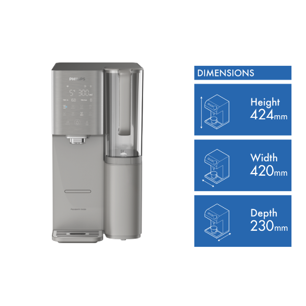 Quench your thirst with the latest in water filtration and customization with the Philips Aquaporin Mineral RO Water Station. This innovative grey water station provides chilled ambient or piping hot water on demand through advanced UV-C LED technology. With a generous 6L total capacity and 1.8L filtered water tank you'll always have cool clean water ready. The intuitive display lets you know your water's quality at a glance. Six precise temperature settings from 45°C to 100°C mean you can enjoy coffee tea or a refreshing glass of water just the way you like it. The compact 230mm x 420mm x 424mm size fits perfectly on your countertop without clutter. Experience the difference purified water makes; this Philips water station can enhance your health through improved hydration and reduced impurities. It also makes cleaning a breeze thanks to the advanced filtration and antimicrobial materials. Invest in long-term water health for your family with the Philips Aquaporin Mineral RO Water Station today. The manufacturer's part number for this product is ADD6921DG/79. Learn more about the benefits of purified water; inquire now about this innovative Philips water station.