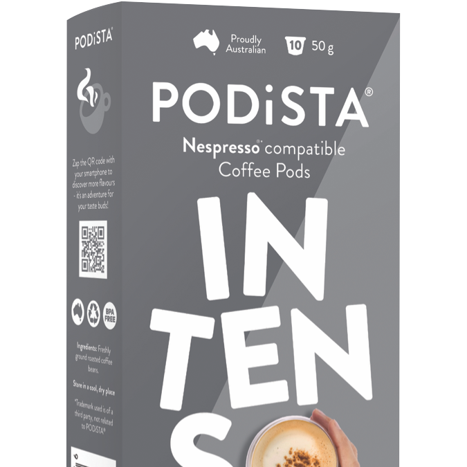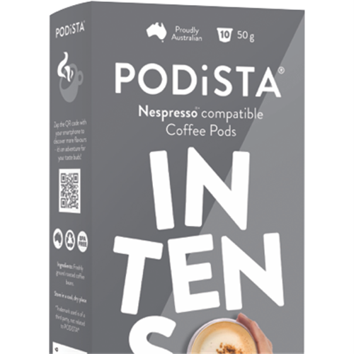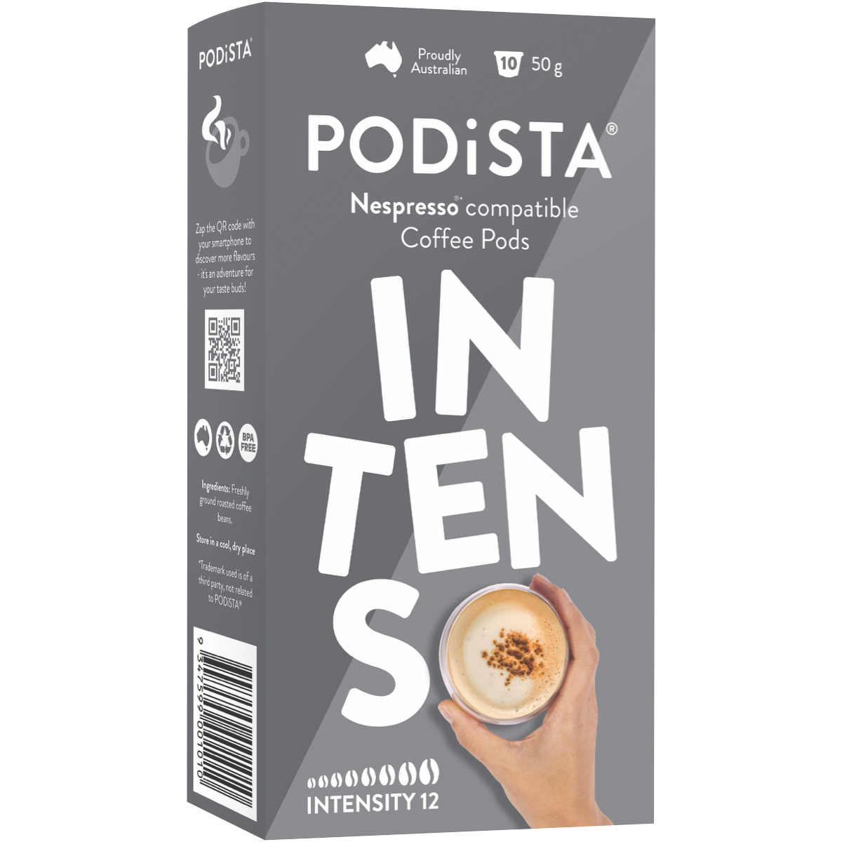 Wake up to the rich intense flavor of Podista Intenso coffee with this 10 pack of coffee pods. These single-serve pods are compatible with Nespresso machines delivering a strong bold coffee experience in seconds. The Intenso blend combines high-quality Arabica beans from Central and South America for a sophisticated flavor profile with subtle hints of roasted cereal. Savor the smooth velvety crema and full-bodied taste of this dark roast coffee. The Intenso pods are perfectly portioned locking in aroma and freshness in each capsule. Simply pop one in your Nespresso machine and let the intense aroma of finely ground coffee fill your kitchen. Treat yourself to a premium coffeehouse-style beverage in the comfort of home.With their easy one-touch operation these coffee pods are perfect for busy mornings when you need a quick caffeine fix. Their small footprint allows neat clutter-free storage. Enjoy the convenience of single-serve coffee that satisfies strong coffee cravings. Experience rich flavor in every cup with the Podista Intenso coffee pod 10 pack. The manufacturer's part number for this product is 200029.