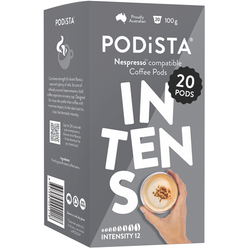 Start your mornings in style with the PODiSTA Intenso coffee pods. These Italian-style coffee capsules are designed for rich robust flavor in every cup. The Intenso pods contain a specially blended dark roast coffee crafted to deliver a bold taste with hints of cocoa and toasted nuts. Pop one of these intense coffee capsules into your compatible pod machine and enjoy a premium coffee shop experience from the comfort of home. With 20 capsules per pack you'll have plenty of intense coffee on hand for busy mornings or afternoon pick-me-ups. The rich crema and full-bodied flavor of Intenso will satisfy any coffee lover. Upgrade your daily cup and experience the intensity of PODiSTA Intenso coffee pods today. The manufacturer's part number for this product is 200057. Discover the convenience and taste of PODiSTA Intenso coffee capsules.