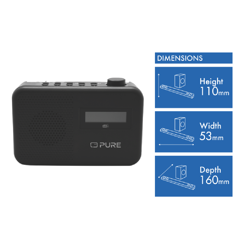 Tune in to your favorite digital radio stations with the Pure Elan One. This compact and stylish radio lets you save up to 5 DAB+ and 5 FM station presets so you can quickly access the music and shows you love. The 2.2 monochrome LCD display is easy to read while the 1.5W speaker delivers clear full-range sound. Want to listen privately? Just plug your headphones into the 3.5mm jack. The sleep timer lets you drift off to your favorite tunes and the telescopic antenna ensures strong reception. Portable and lightweight at just 0.35kg the Elan One is perfect for any room in your home. Comes with USB cable quick start guide and a 2-year warranty. 252517.