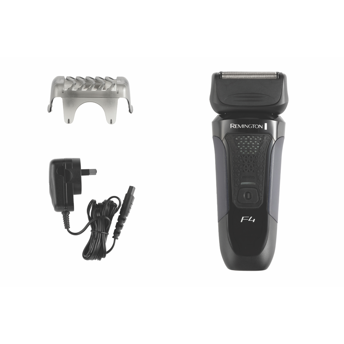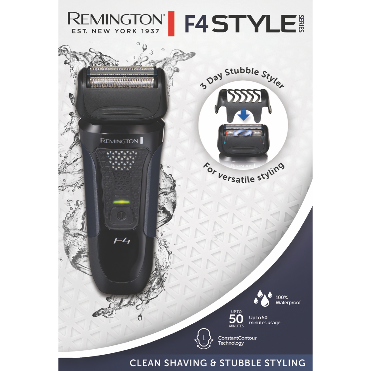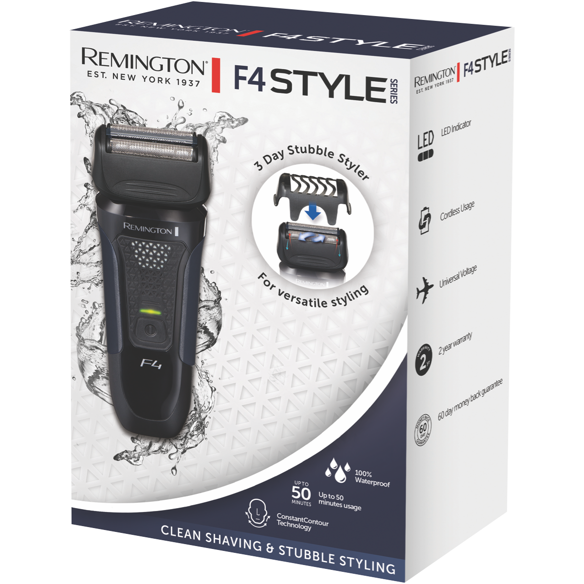 Take grooming to the next level with the Remington F4 Style Series Foil Shaver. This innovative foil shaver glides over your skin for an effortless close shave. The Comfort Trim pop-up trimmer tackles longer hairs while ConstantContour Technology adapts to every contour of your face. With up to 50 minutes of cordless runtime from a 4 hour charge you can shave wherever needed. The washable LED-indicator screen and 2 year warranty provide extra convenience. For the ultimate shaving experience add the Remington F4 to your morning routine.