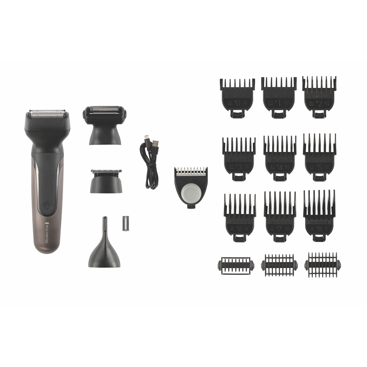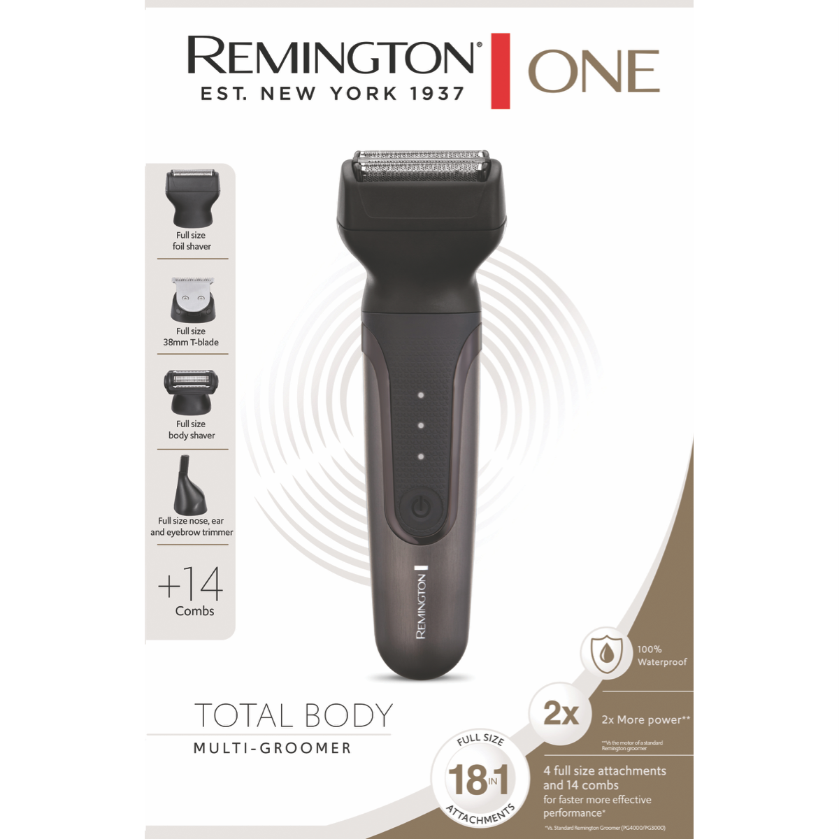 From a precise T-blade to a full-size shaver the Remington One Total Body Multi Groomer offers up to 60 minutes of cordless grooming for men who want to trim and style with precision. This versatile all-in-one grooming kit features a wet and dry body trimmer with 14 adjustable combs for trimming and detailing your beard hair nose ears and body. The 38mm wide blade on the waterproof trimmer delivers smooth even trims on wet or dry skin. Charge it up in just 2 hours for cordless use anywhere. A quick 5-minute charge powers it up for 5 minutes of grooming on-the-go. LED indicators let you check the battery level at a glance. The Multi Groomer comes with 4 styling attachments - a foil shaver precision T-blade body hair trimmer and adjustable stubble comb. From a close 1mm to a fuller 5mm beard you'll find the right settings for your style. The eyebrow nose and ear combs add detail to your grooming routine. Everything fits neatly inside the included storage pouch for tidying up and travel. With a 3-year warranty and precise trimming power the Remington Multi Groomer helps you look your best every day. The manufacturer's part number for this product is PG780AU. Bring home the Multi Groomer for all your grooming needs.
