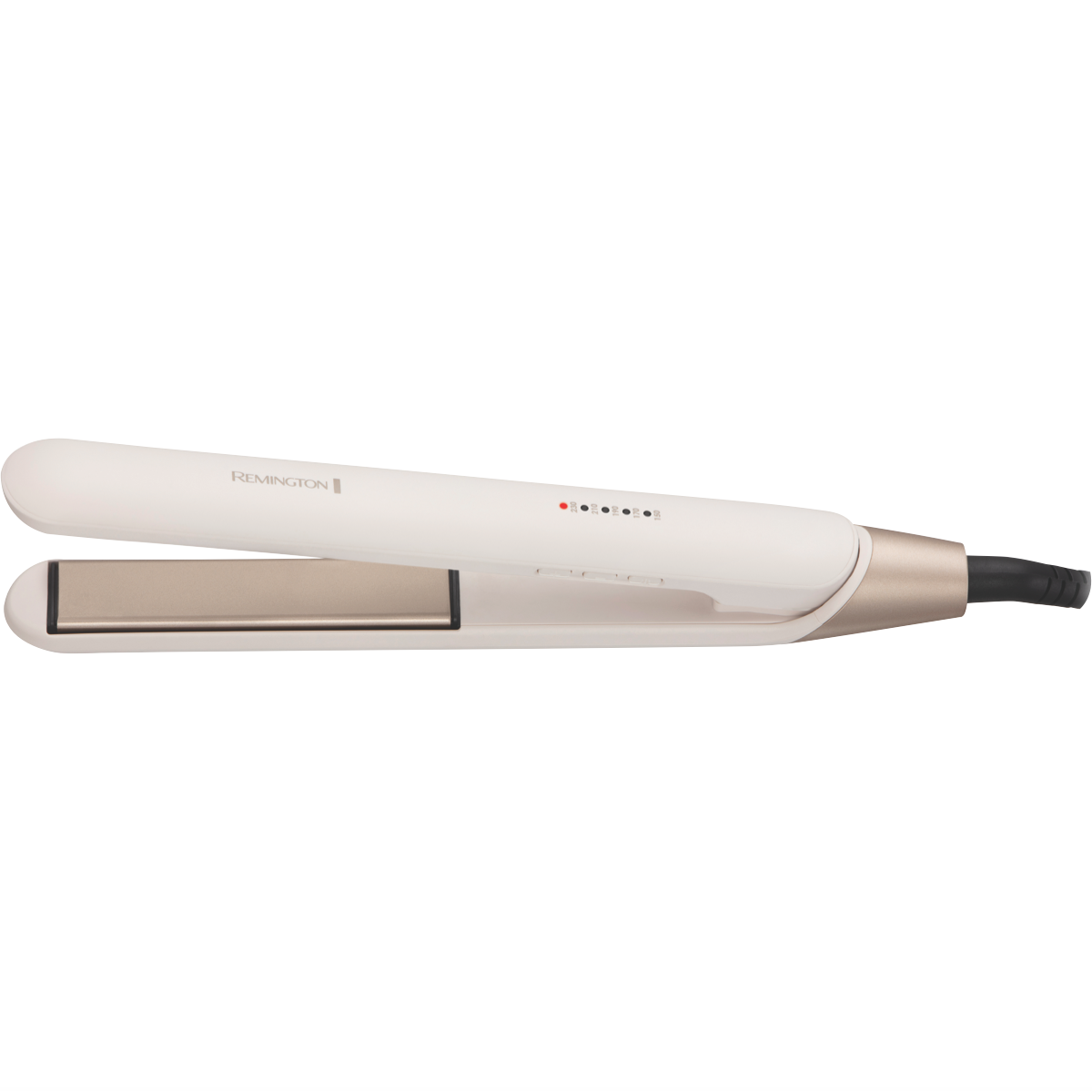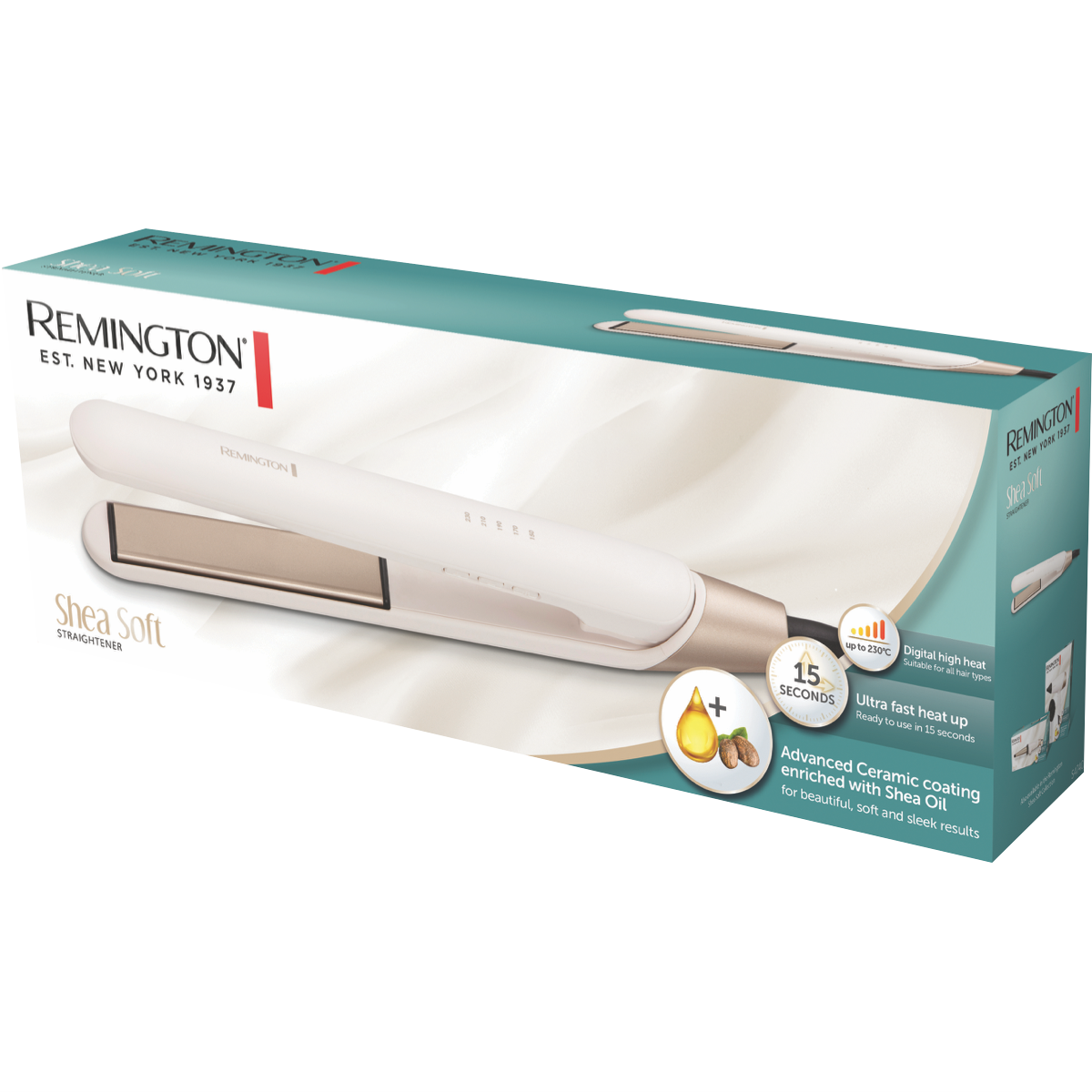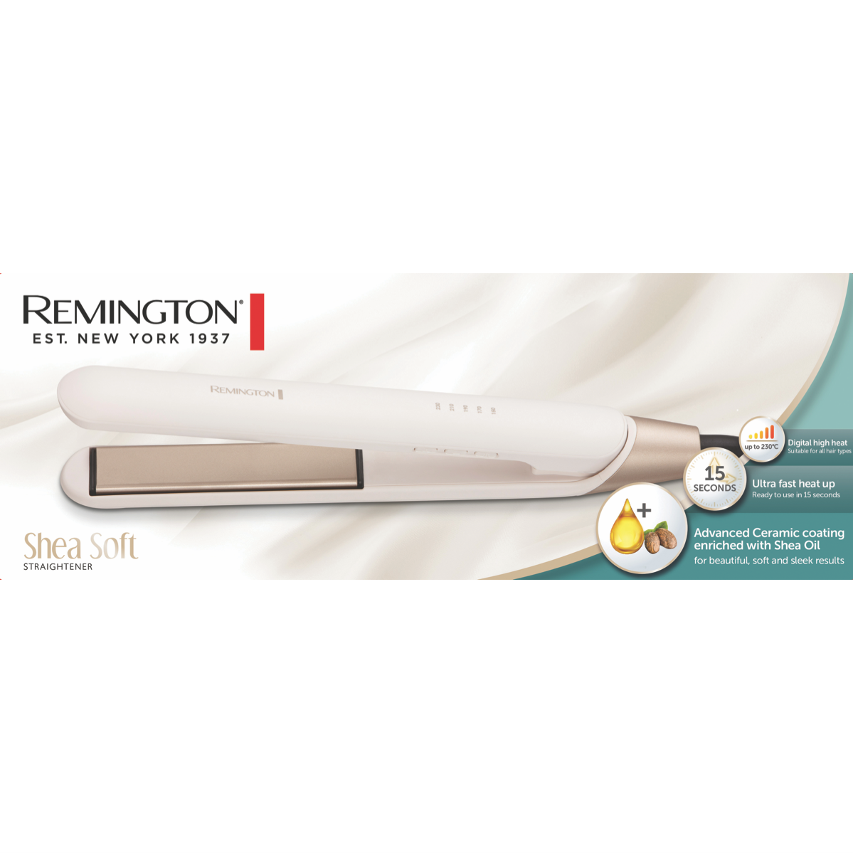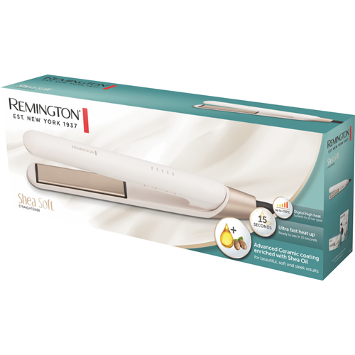 Achieve silky smooth frizz-free hair with the Remington Shea Soft Straightener. This advanced ceramic hair straightener features 110mm plates and heats up in just 15 seconds reaching temperatures between 150 and 230 degrees Celsius for fast and effective straightening. The ionic conditioning technology helps reduce frizz and static leaving hair looking sleek soft and shiny. With safety features like automatic shutoff after 60 minutes and plate lock you can style your hair with peace of mind. The LED indicator lights turbo boost function and special curved housing design provide ease of use and optimal straightening results. Compatible with worldwide voltages and equipped with a swivel cord and storage pouch for convenience this straightener allows you to achieve salon-quality straight hair whether at home or on the go. Backed by Remington's 3 year warranty the Shea Soft Straightener's durable high-performance design provides smooth frizz-free styling for all hair types. Achieve your desired look with this innovative hair straightening solution. The manufacturer's part number for this product is S4740AU. Transform your style with the Remington Shea Soft Straightener today.