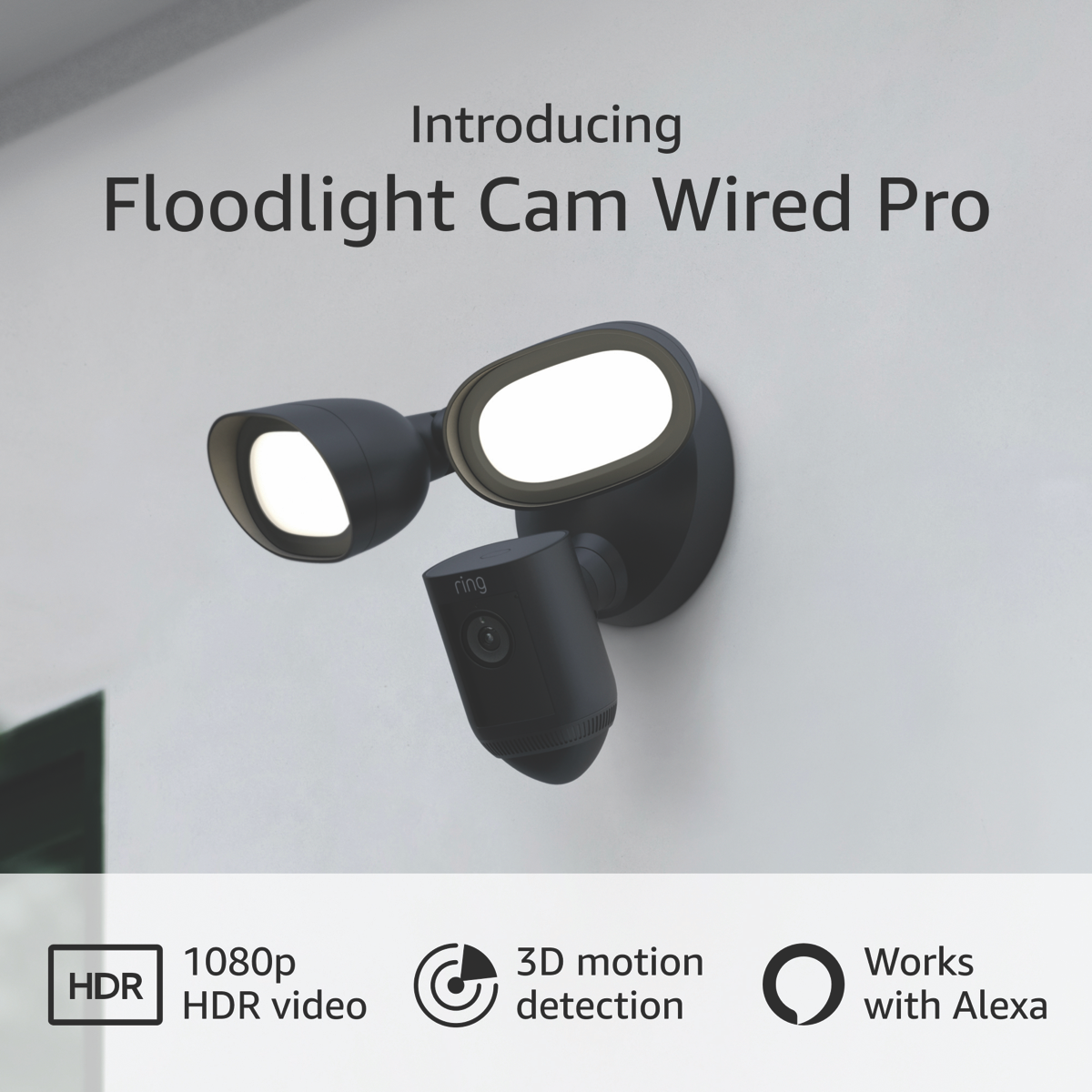 Our most advanced outdoor security camera. Upgrade your outdoor security with Floodlight Cam Wired Pro. Stop crime in its tracks with ultra-bright LED floodlights. Stay protected in almost any weather condition with our new 3D Motion Detection. And monitor motion events from above with Bird s Eye View.