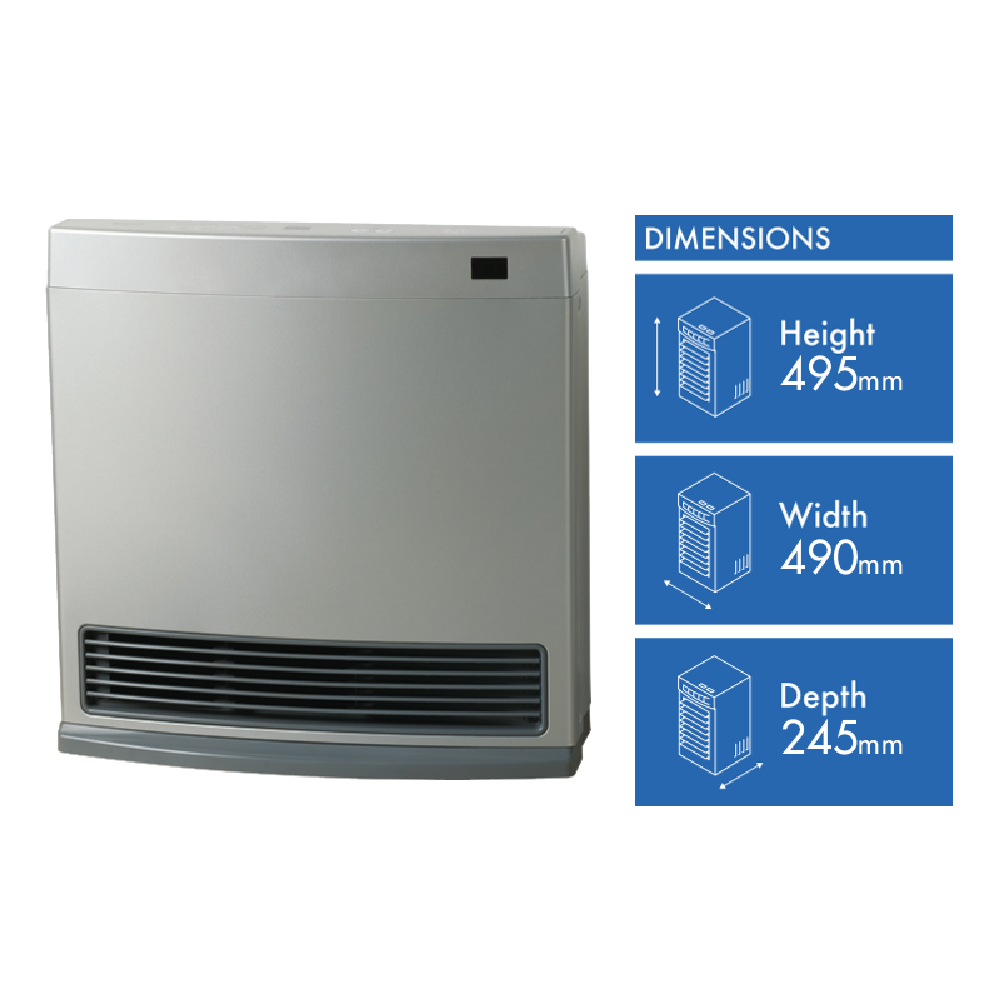 This platinum silver Rinnai Dynamo 15 DY15SN natural gas heater effectively and efficiently heats small to medium sized rooms. It has a 5.8 energy efficiency rating low emissions technology less than the Australian Standard and fully thermostatic set and forget operation. The Rinnai Dynamo gas heater features dual programmable timers for morning and evening operation a child lock and convenient remote control operation. It's easy getting cosy warm with the portable Rinnai Dynamo 15 unflued natural gas heater.
