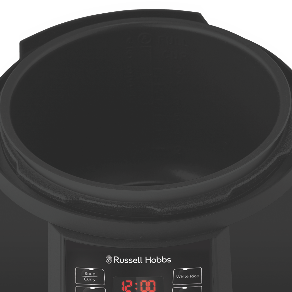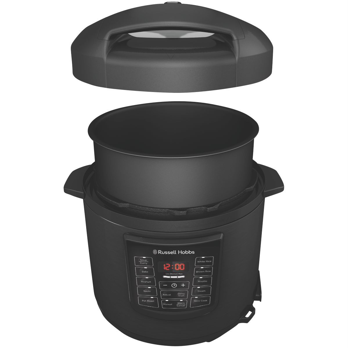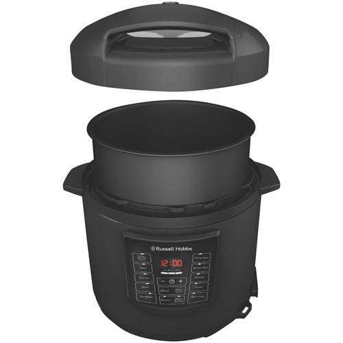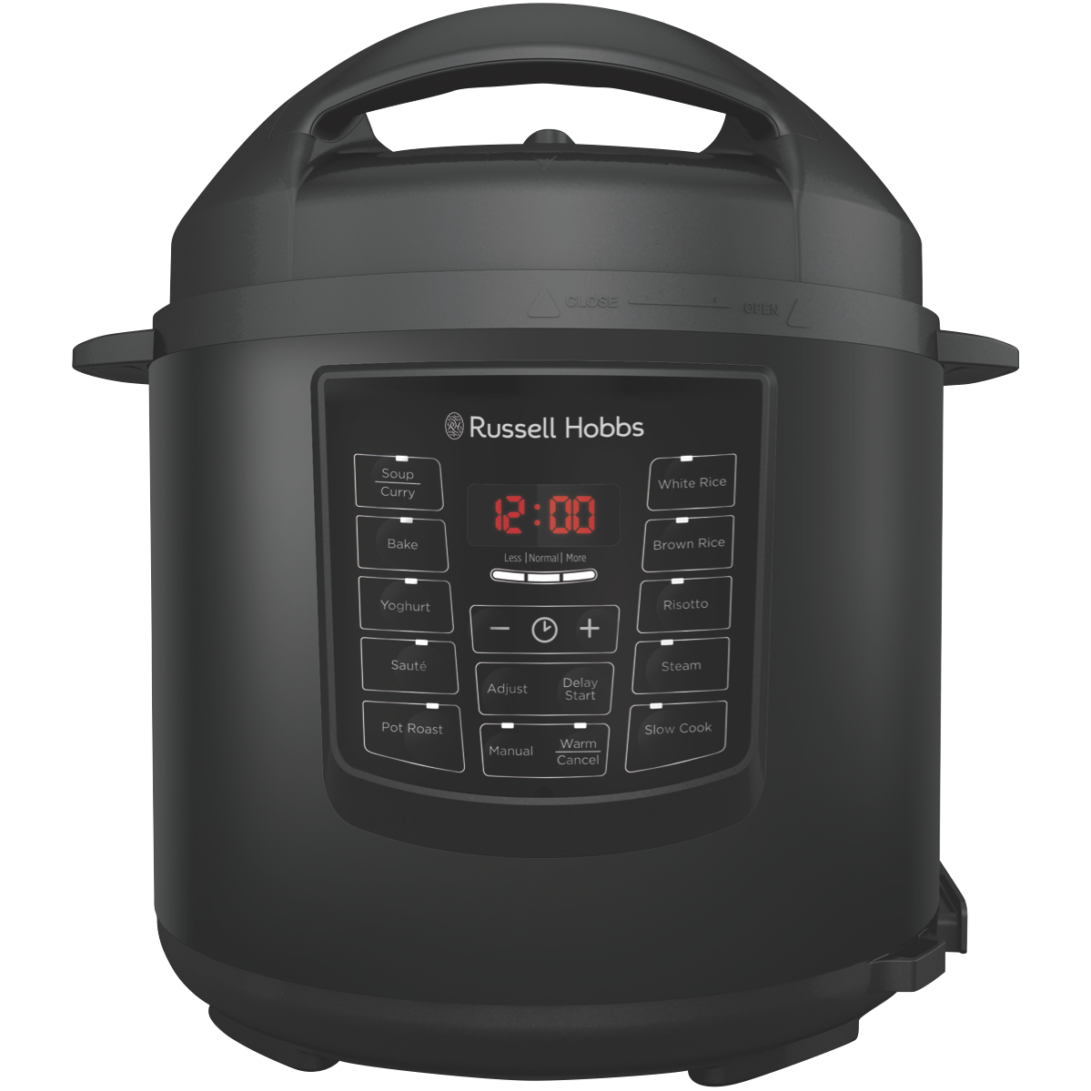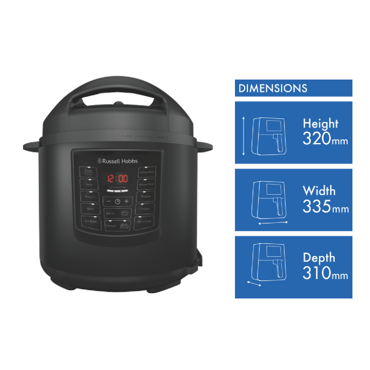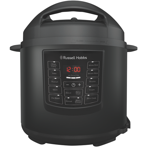 Revolutionize meal preparation with the versatile Russell Hobbs 11-in-1 Digital Multi Cooker. This multicooker features an easy to use digital display with LED lights letting you effortlessly select from 8 pressure and 3 non-pressure pre-set cooking modes like bake and yoghurt. The locking jar-style lid ensures maximum safety when pressure cooking while the auto keep warm function maintains perfect serving temperature after cooking completes. With a generous 5.3kg capacity in a compact 340mm x 320mm x 340mm frame this black multicooker whips up family-sized portions. It comes equipped with a serving spoon trivet rice measuring cup and 2 year warranty for durability. This multicooker's preset programs delayed start timer and non-stick inner pot simplify cooking rice soups curries chilli desserts and more. Let the Russell Hobbs 11-in-1 Digital Multi Cooker open up new possibilities in your kitchen. The manufacturer's part number for this product is RHPC3000. Check out this multicooker to make mealtimes easier.