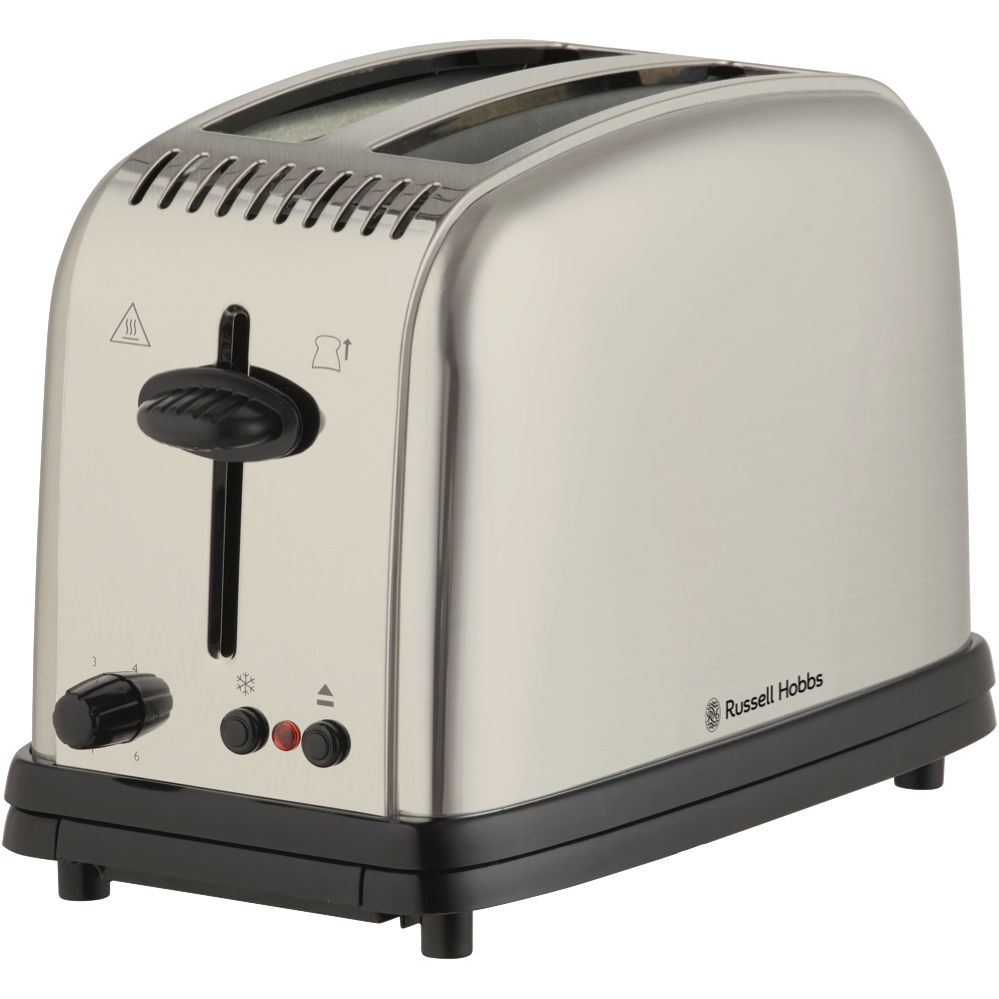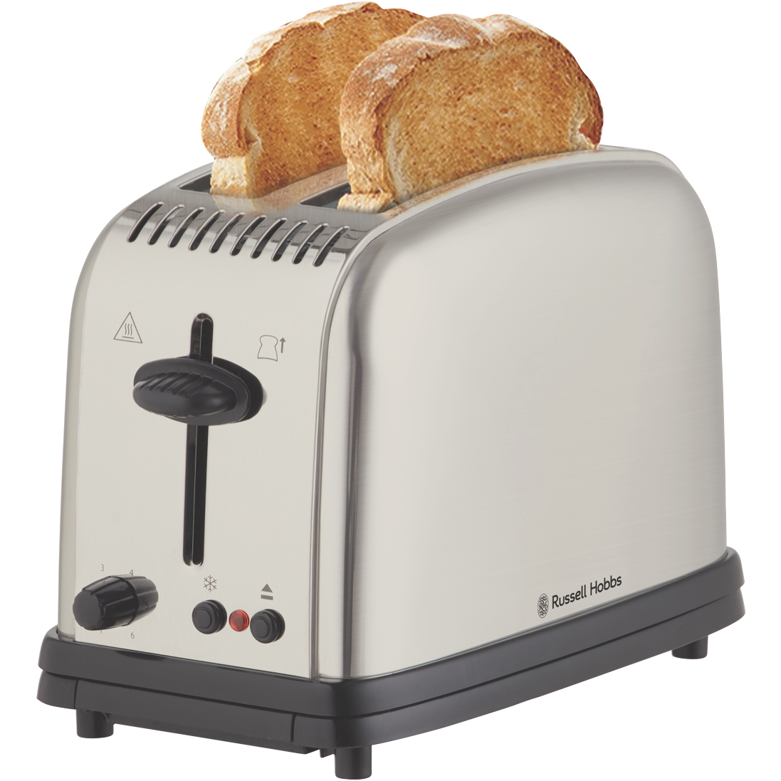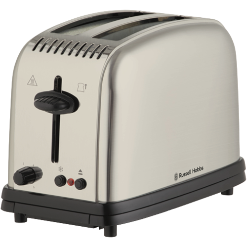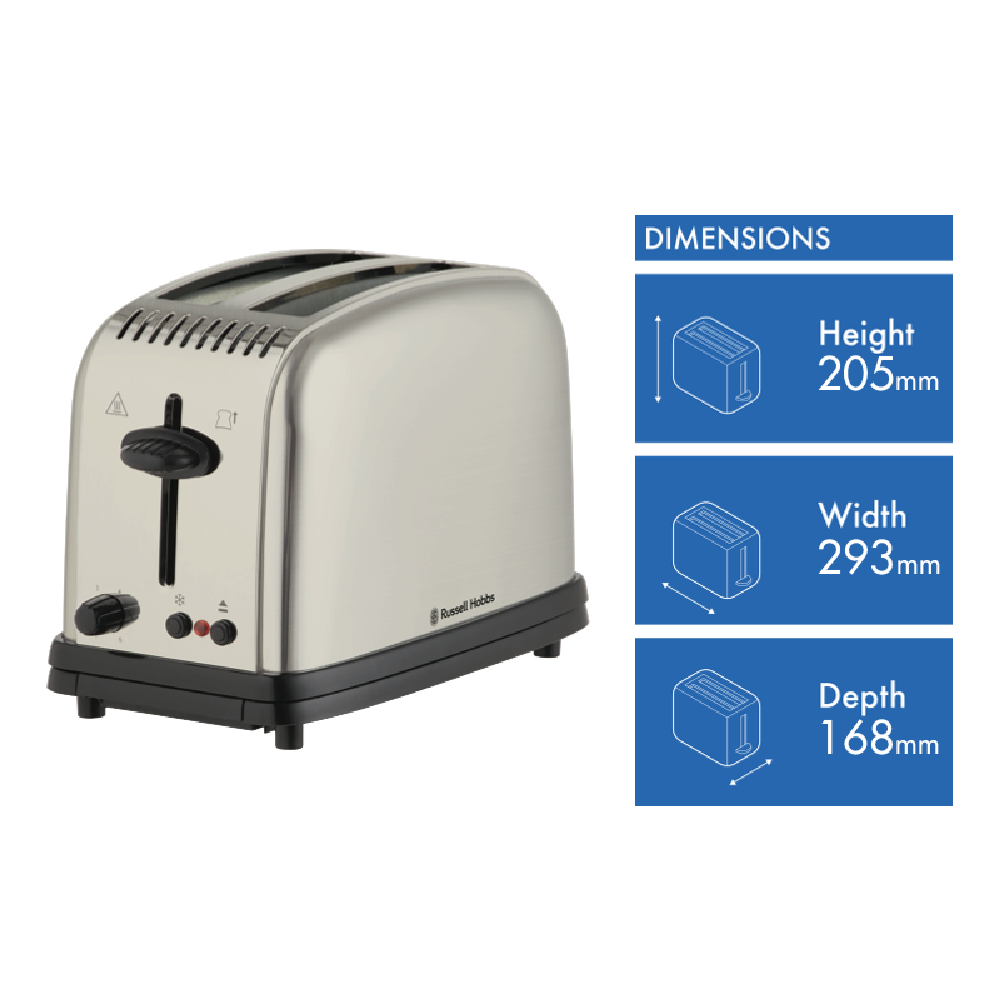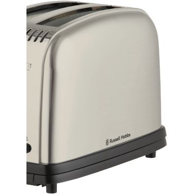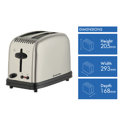 Level up your morning routine with the Russell Hobbs Classic 2 Slice Toaster. This stainless steel toaster features self-centring slots that adapt to fit a range of bread sizes from thick artisan loaves to thin sliced white bread. The variable browning control and high lift lever allow you to toast bread exactly the way you like it while the removable crumb tray keeps your countertop clutter-free. With faster toasting technology you can enjoy perfectly toasted bread and bagels in no time. Extra wide slots accommodate everything from crumpets to muffins. Durable stainless steel construction and Russell Hobbs' 2 year warranty ensure this toaster will be a reliable addition to your kitchen for years to come. The manufacturer's part number for this product is RHT12BRU. Bring cafe-quality toast to your home with the Russell Hobbs Classic 2 Slice Toaster today.
