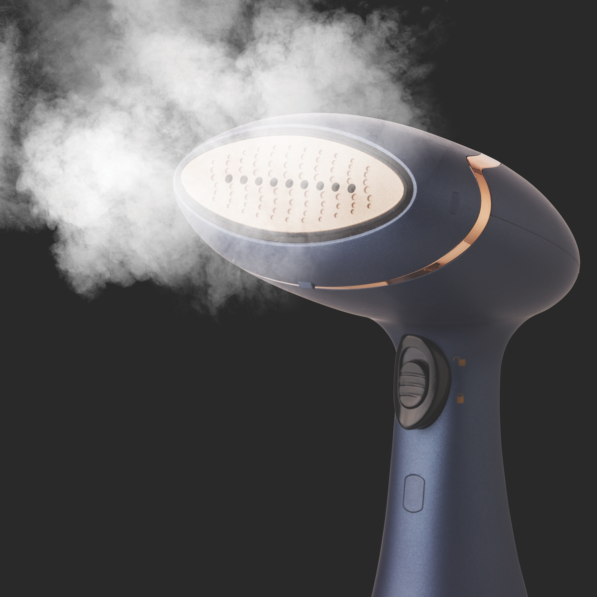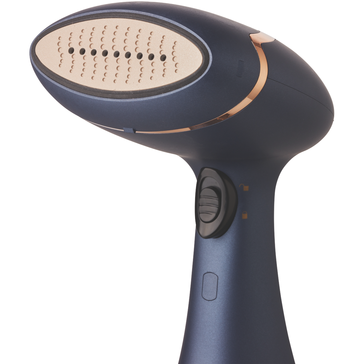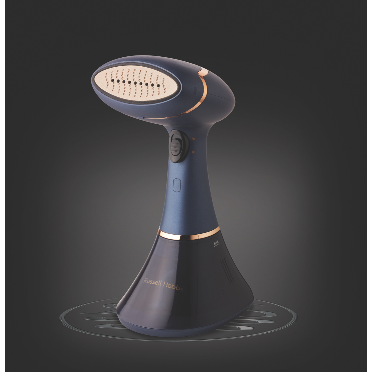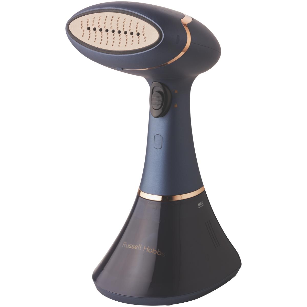 Steam in style with the Russell Hobbs Handheld Supreme Steamer RHC410 in beautiful navy and champagne. It heats up in just 45 seconds to get the job done quicker with no ironing board simply hang and swipe over your tops and bottoms. Steam up to 25% faster(1) and kill up to 99% of bacteria(2) for the ultimate in freshness. Deliver 30g of steam continuously for iron-like performance. An anti static coating will keep shirts and pants free of excess static charges and a 15 minute auto shut off will ensure safety. Included is a unique scent infuser attachment with five reusable tabs for lots of refreshing scent choices along with attachments for delicates upholstery and a lint brush. Disclaimers: (1) Versus RHC400 Handheld steamer. (2) Based on lab testing versus Staphylococcus aureus ATCC 6538 and Klebsiella pneumoniae ATCC 4352 when exposed for 1 minute at 1cm from handheld steamer s faceplate using continuous steam and no attachment. Tested on cotton polyester and stainless steel.