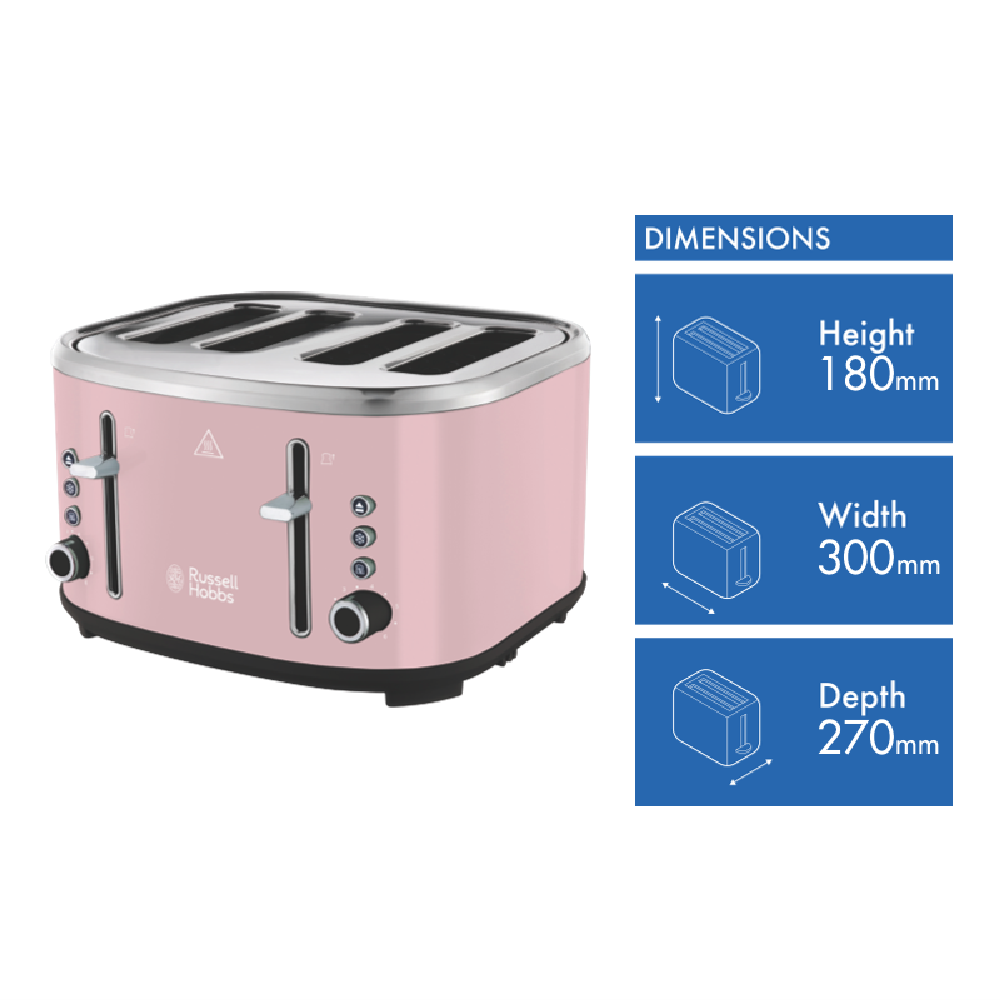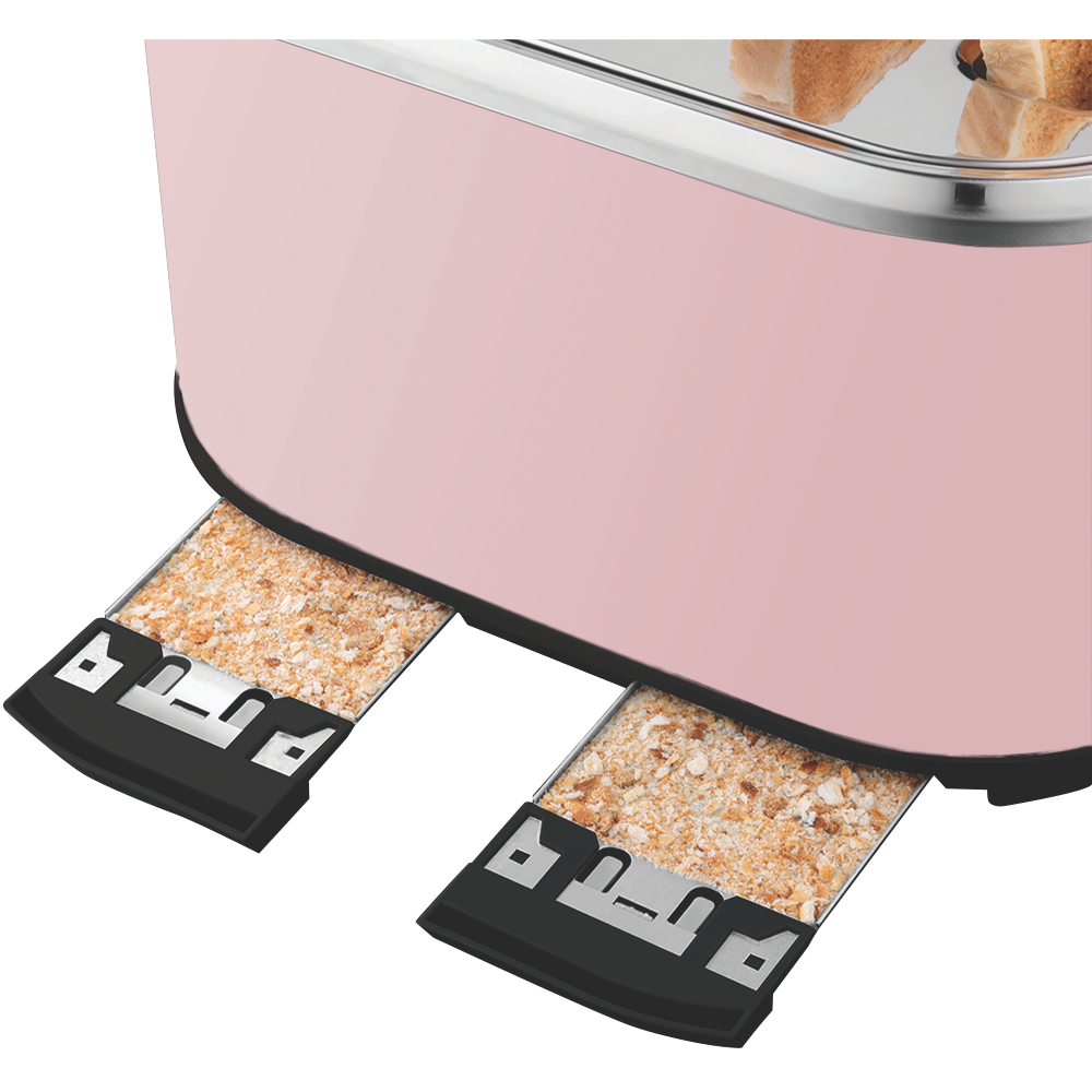 Bring breakfast to life with the Russell Hobbs Legacy 4 Slice Toaster in stylish pink. This wide slot toaster not only looks great but helps you create perfect toast easily with 1670 watts of power across 4 extra-deep and self-centering slots wide enough for thick artisanal breads or bagels. Illuminated control buttons make operation a breeze while variable browning settings ensure customized results every time. Defrost bread right inside the toaster or use the reheat function to gently warm toast. With a high lift lever removable crumb tray cord storage and Russell Hobbs' 2 year warranty this Legacy toaster has both beauty and brains. Upgrade your breakfast routine with the versatile pink Russell Hobbs 4 slice toaster today. The manufacturer's part number for this product is RHT445PNK. Check it out now to enjoy delicious toast for years to come.