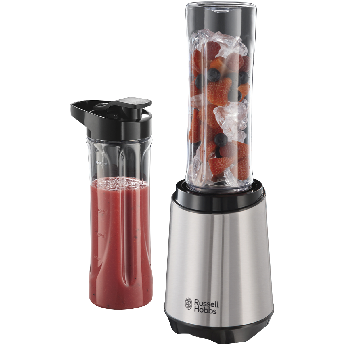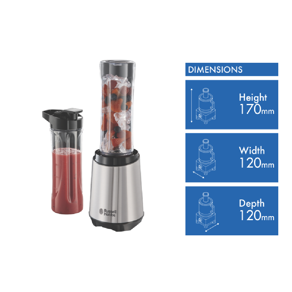 Blend healthy smoothies and shakes with ease using the Russell Hobbs Mix and Go Classic blender. This 300W stainless steel blender comes equipped with two 600ml travel bottles letting you blend and go. The brushed stainless steel body not only looks sleek in any kitchen but it is durable and easy to clean. With dishwasher safe parts you can simply rinse the two BPA-free bottles and ice crush blades after blending up your favorite fruits veggies and protein powders. Whether you want to make a green smoothie for breakfast or a protein shake after the gym this blender lets you quickly whip up drinks and take them on the go. The compact size takes up minimal counter space while still packing the power you need to pulverize ingredients into delicious beverages. Stop buying overpriced blended drinks and start making your own nutritious creations with this on-the-go blender. Take your health into your own hands and blend vibrant smoothies you'll love. The manufacturer's part number for this product is RHBL300.
