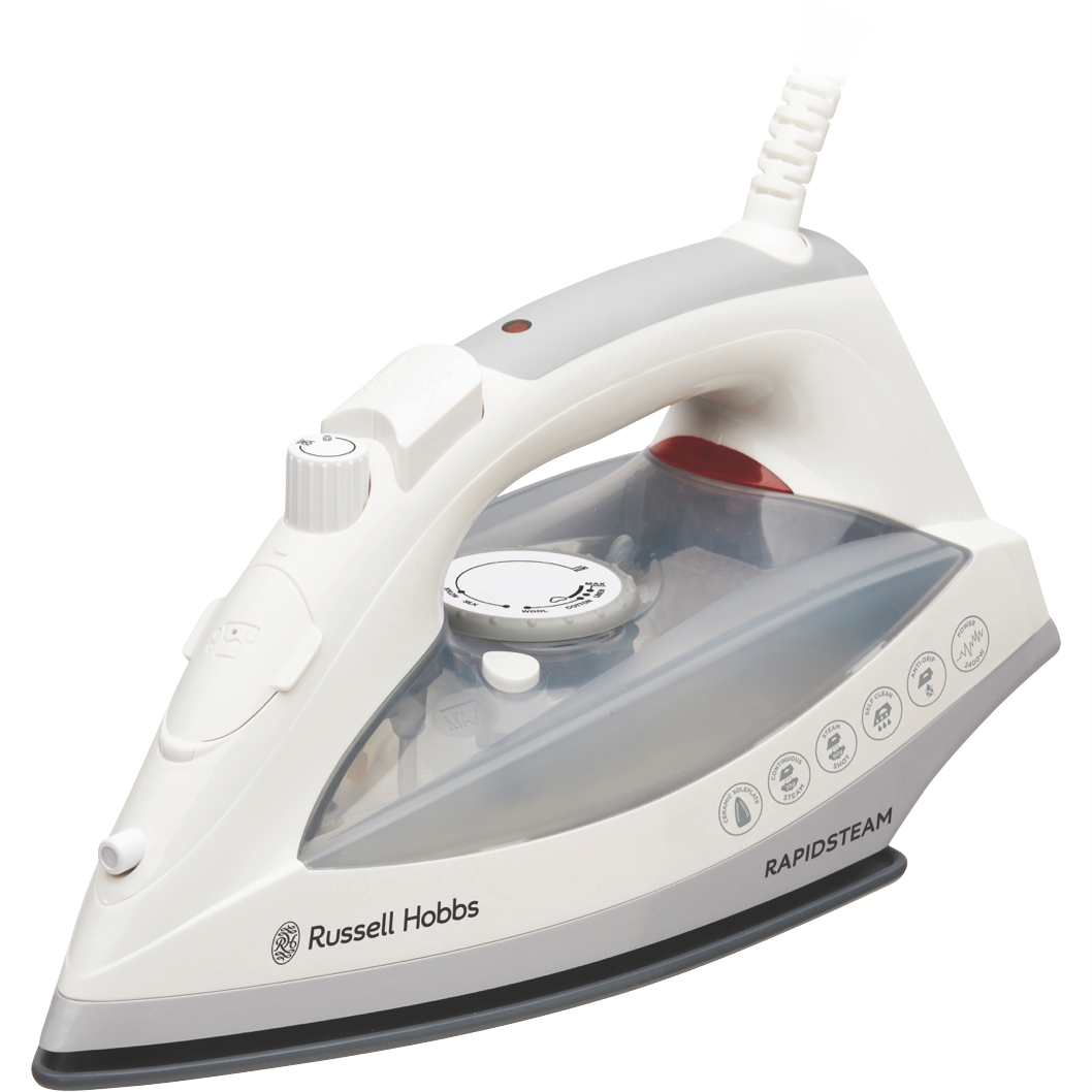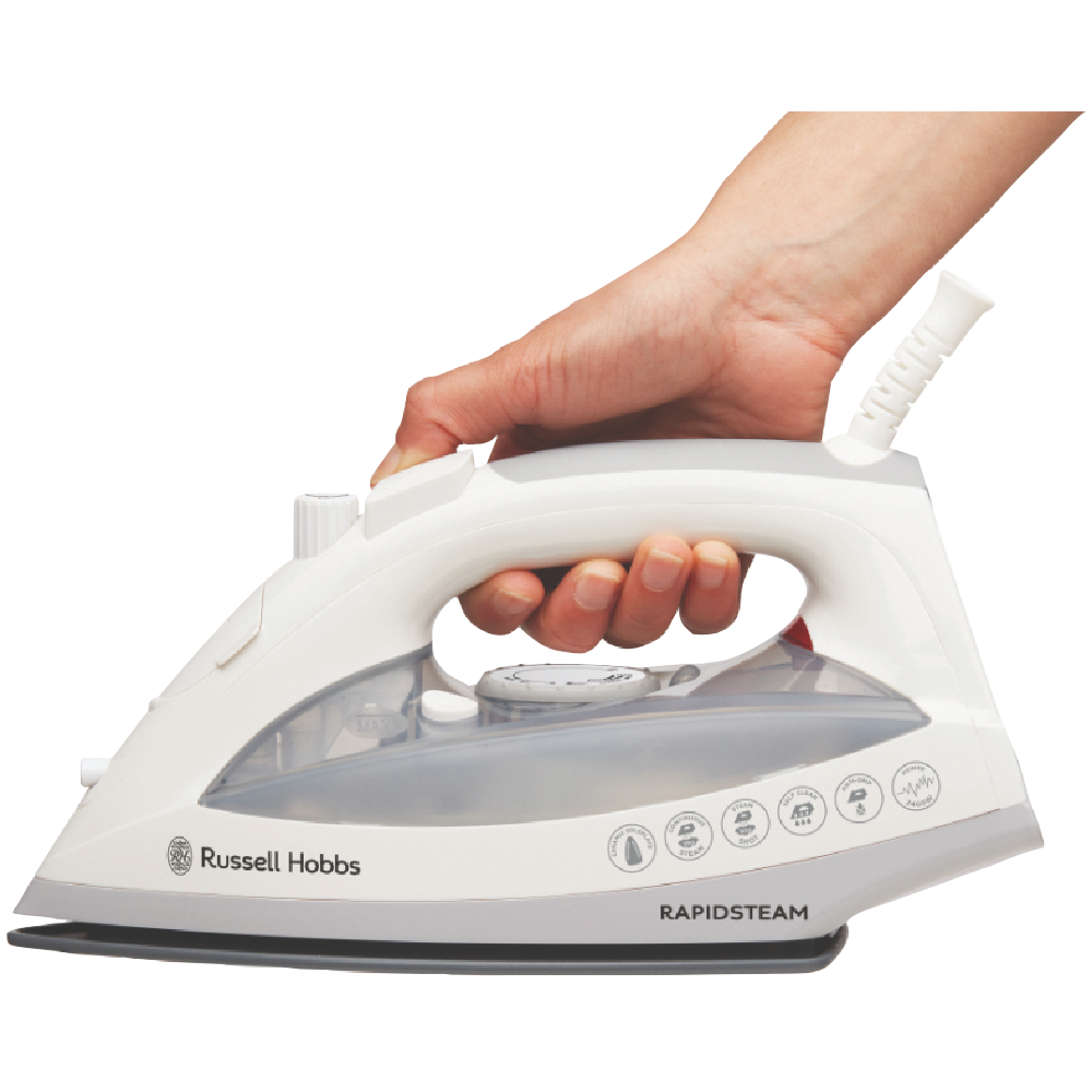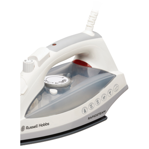 Take the hassle out of ironing with the Russell Hobbs Rapidsteam Iron. This powerful 2400W iron with its 45g/min steam output and 90g/min steam shot makes quick work of stubborn creases and wrinkles. The smooth gliding non-stick high-grade ceramic soleplate simply floats over all fabrics. With its large 280ml water tank anti-drip function and self-clean setting this white 1.3kg iron lets you power through your ironing. Measuring 270mm long and 112mm wide its 300cm power cord gives you the flexibility to manoeuvre around the largest loads. The two year warranty provides reliable performance and peace of mind. The manufacturer's part number for this product is RHC902. Bring ease and speed to your ironing today with the Russell Hobbs Rapidsteam.
