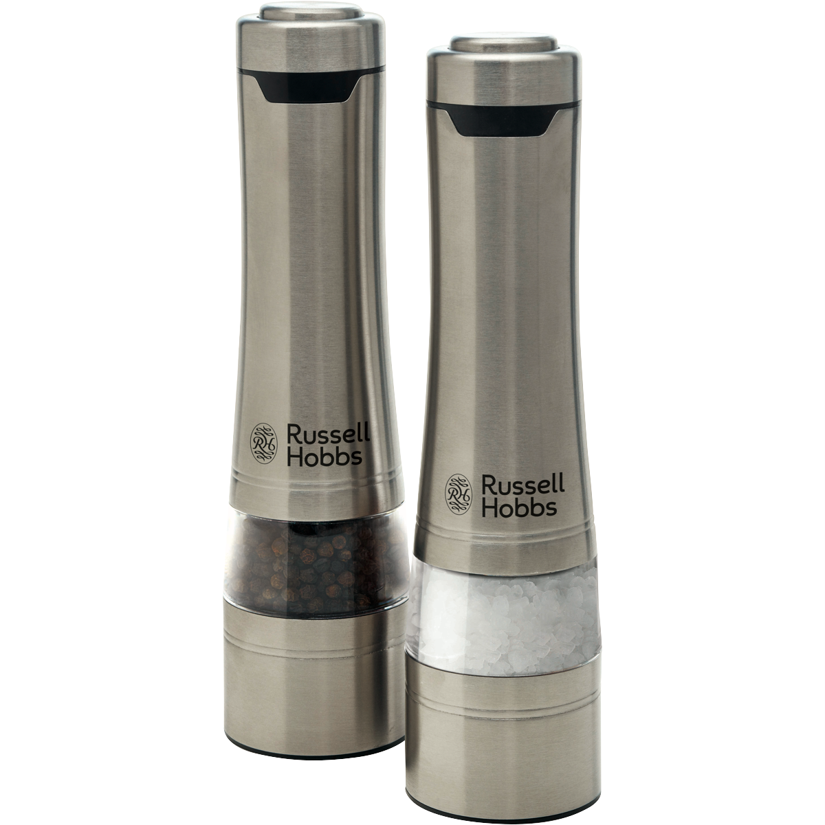 Elevate your kitchen with this stylish set of Russell Hobbs salt and pepper grinders. Precision engineered with durable stainless steel and a clear acrylic window these mills add sleek functionality to spice up your cooking. The adjustable grinder gives you complete control over the coarseness ensuring freshly ground pepper and salt with every turn. Designed for easy refilling the window allows you to monitor your supply levels. With a sleek silver finish the mills complement any modern kitchen décor. Whether preparing your favourite pasta dish or seasoning a juicy steak you'll enjoy the convenience of freshly ground spices on demand. Unlock the full potential of your spices and take your cooking to new heights with the Russell Hobbs salt and pepper mill set. The manufacturer's part number for this product is RHPK4000. Check out this quality kitchen essential today.