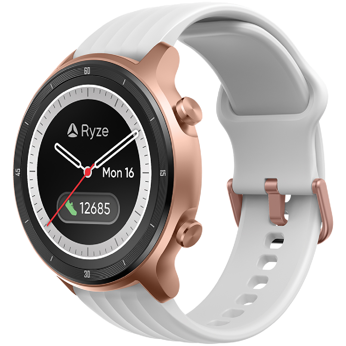 Step into a world of style and functionality with the Ryze Flex Smartwatch Rose Gold with Pink Strap. This sleek smartwatch pairs seamlessly with your active lifestyle keeping you connected and motivated. The 1.28 touchscreen display delivers at-a-glance notifications while the built-in heart rate monitor pedometer and sleep tracking provide valuable health insights. Water resistant up to 3 ATM this smartwatch can handle splashes and sweat. Bluetooth 5.0 connectivity ensures easy pairing with your smartphone. Weighing just 180g the lightweight Ryze Flex feels comfortable on your wrist all day long. The included bonus strap lets you switch up your look in a snap. With up to a year of battery life you can rely on this smartwatch to keep pace with your on-the-go routine. The manufacturer's part number for this product is RZ-FLPK. Make every moment count by adding the Ryze Flex to your daily ensemble.