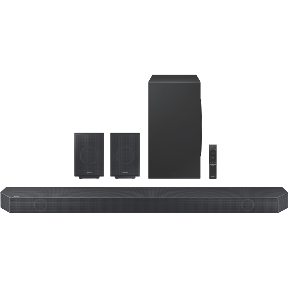 Transform your home entertainment experience with the powerful Samsung 11.1.4ch Dolby Atmos Soundbar. This sleek black soundbar delivers an immersive cinema-quality surround sound letting you feel like you're inside the action. With 11 channels including dedicated woofers and upfiring speakers and Dolby Atmos technology this soundbar fills your room with multi-dimensional audio. Connect via HDMI Bluetooth WiFi Chromecast AirPlay 2 or Spotify Connect. With built-in Alexa and Google Assistant you can play music get answers and control your smart home with just your voice. With sound modes optimized for movies music gaming and more you'll enjoy incredible audio tailored to what you're watching or listening to. The included wireless subwoofer adds deep rich bass while the rear speakers complete the surround sound experience. Control it all easily with the included remote. Transform your TV's sound and bring entertainment to life with the Samsung 11.1.4ch Dolby Atmos Soundbar. The manufacturer's part number for this product is HW-Q990C/XY.