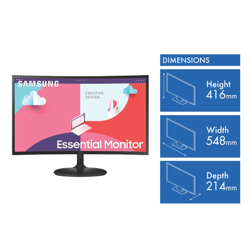 Step into a curved world of vibrant Full HD entertainment with the Samsung 24 Curved LED VA Monitor. Its immersive 1800R curvature combined with a crisp 1920 x 1080 resolution provides a truly cinematic viewing experience that pulls you into the action. AMD FreeSync technology delivers smooth tear-free visuals by syncing the monitor's 75Hz refresh rate to your graphics card. With a 3000:1 contrast ratio this VA panel produces deep blacks and brilliant whites. Tilt swivel and height adjustment allows you to find your ideal viewing position. Connect your PC or laptop via HDMI and enjoy lag-free gaming thanks to the quick 4ms response time. Or plug in headphones and get lost in your favourite movies and music. Measuring 24 inches diagonally with a 16:9 widescreen aspect ratio this sleek curved monitor brings games and movies to life. Weighing only 3.1kg it has a compact footprint that saves desk space. For total peace of mind Samsung provides a 3 year warranty. Step up your viewing experience with the vivid colours and immersion of the Samsung 24 Curved LED VA Monitor. The manufacturer's part number for this product is LS24C360EAEXXY. Make this stylish curved display the centerpiece of your desktop setup today.