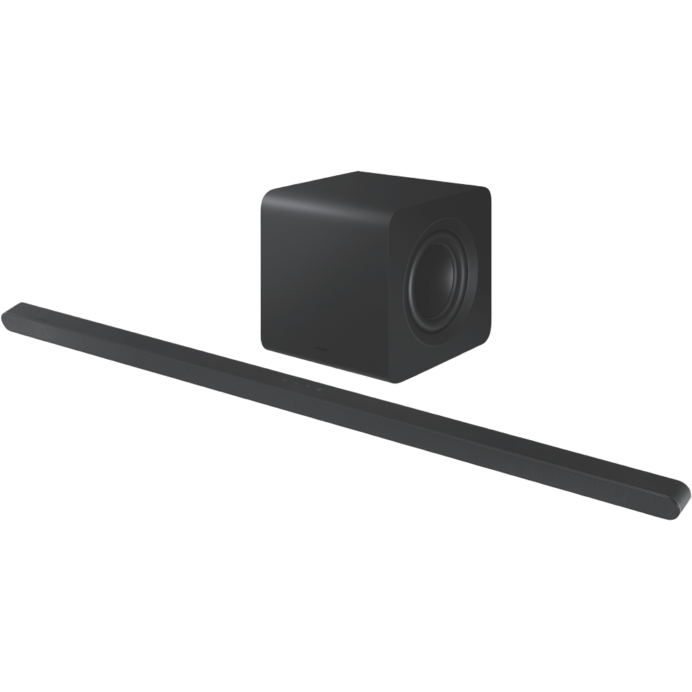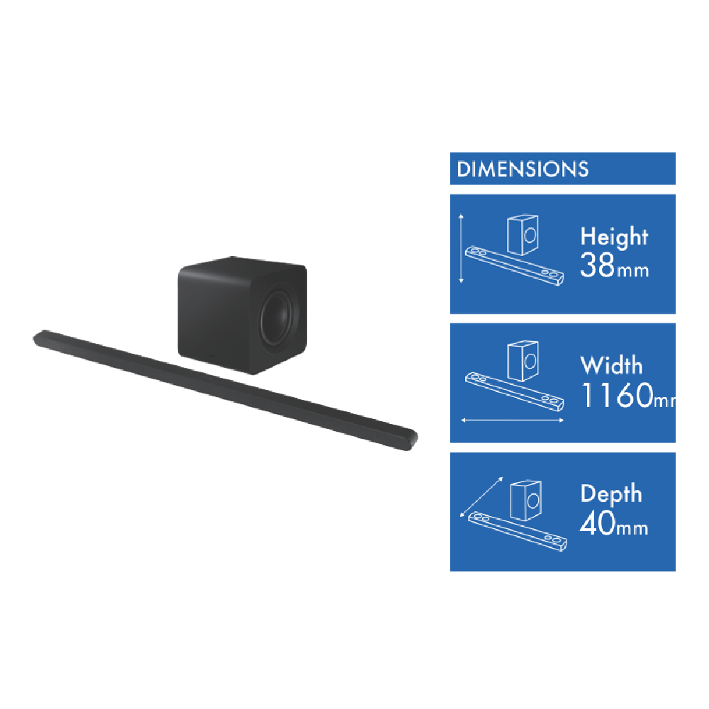 Transform your home entertainment with the Samsung 3.1.2ch Ultra Slim Dolby Atmos Soundbar. This sleek black soundbar delivers an immersive 3D cinematic experience thanks to Dolby Atmos and DTS Virtual:X surround sound expansion technology. Connect via HDMI HDMI ARC Bluetooth or Wi-Fi for seamless integration. Control everything easily with your voice using Google Assistant or Alexa built-in. Adaptive Sound automatically optimizes audio settings to suit what you're watching. Game Pro mode enhances in-game audio for a competitive edge. The wireless subwoofer produces deep rich bass you can feel. With the soundbar measuring just 38mm high it fits perfectly in front of your TV without blocking the picture. The manufacturer's part number for this product is HW-S800D/XY. Experience movie theater-quality sound in your living room today.