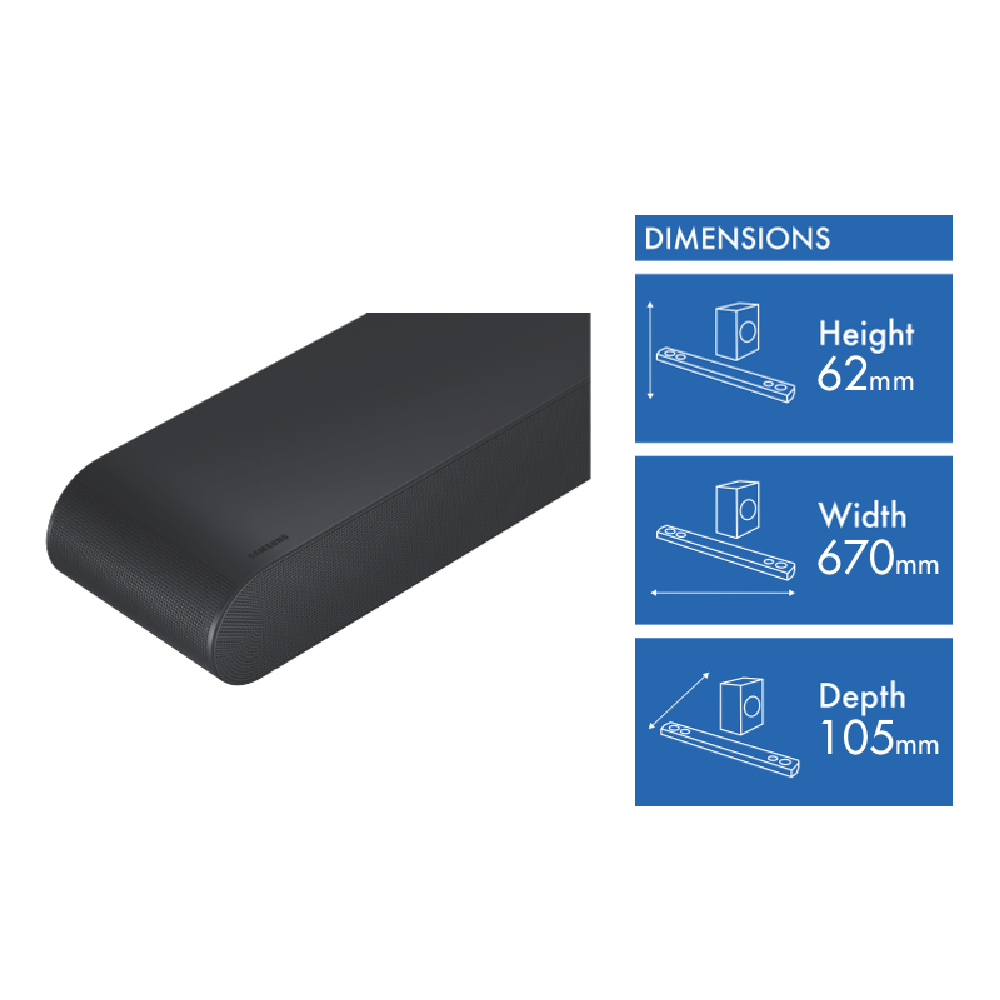 The Samsung HW-S60D/XY is 5.0 Channel all in one sound bar. It was designed to complement your style. The texture and its timeless curved design can blend seamlesslyinto your space while still creating exceptional room filling sound. It features the sound of Wireless True Dolby ATMOS & DTS:X audio content. Overhead and multi directional sound immerses you in a captivating experience all without HDMI cables.